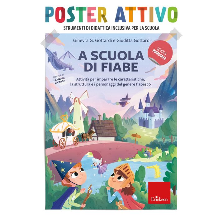 Poster Attivo - A scuola di fiabe rende lo spazio verticale delle pareti delle aule scolastiche il fulcro di movimento fisico, di azione didattica, di gioco e riflessione, ampliando le possibilità che già lo spazio orizzontale dell'aula mette a disposizione della scuola. Le numerose attività proposte in A scuola di fiabe hanno una difficoltà crescente e garantiscono il progressivo consolidamento e potenziamento delle conoscenze degli elementi fondamentali della fiaba. Il volume è strutturato in tre parti: l'introduzione offre una panoramica teorica del mondo della fiaba e un excursus sulle metodologie didattiche utilizzate per coinvolgere, divertire e formare gli alunni e le alunne, la presentazione dei materiali analizza tutti gli strumenti necessari allo svolgimento delle attività . L'ultima parte del testo propone una guida alle attività da realizzare in classe. Il poster è strutturato con elementi infografici che permettono un approccio visivo nuovo al genere della fiaba. La parte superiore del poster e dedicata alla scalata dell'eroe, invece del classico sentiero tortuoso, metafora del difficile e faticoso cammino dell'eroe attraverso le insidie della fiaba, nel poster viene proposta una prospettiva centrale che ha il suo punto focale nel castello, ideale destinazione del protagonista. Il sentiero da seguire è una scala a pioli da risalire, dove ciascun gradino è caratterizzato da un colore diverso: il verde rappresenta la situazione rilassata e bucolica tipica dell'inizio delle fiabe; il rosso rompe con la sua violenza l'equilibrio iniziale introducendo l'antagonista; l'arancione caratterizza la fase relativa alle prove che l'eroe deve superare; l'azzurro finale denota il ritorno alla quiete e l'arrivo al lieto fine. Completano il poster le buste contenenti le carte che rappresentano le varie componenti della fiaba.
