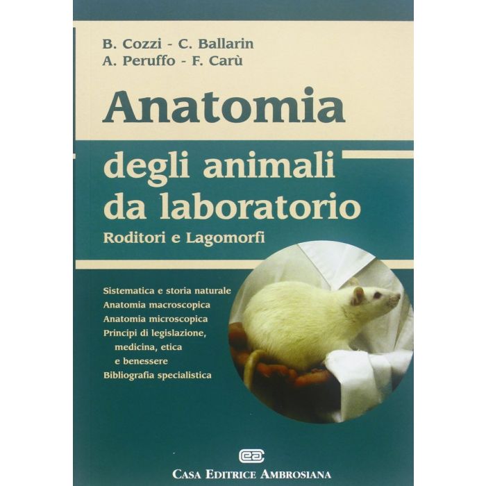 | Indice | Parte prima, Sistematica degli animali da laboratorio: Premessa, roditori e lagomorfi - Ratto - Topo - Criceto - Gerbillo - Cavia - Coniglio. Parte seconda, Anatomia degli animali da laboratorio: Apparato tegumentario - Apparato locomotore - Apparato cardiovascolare e linfatico - Apparato digerente - Apparato respiratorio - Apparato urinario - Apparato genitale maschile - Apparato genitale femminile - Sistema nervoso - Organi di senso - Apparato endocrino - Risonanza magnetica nucleare. Parte terza, Principi di scienza e medicina degli animali da laboratorio: benessere, legislazione e buone pratiche per la cura dell’animale: Legislazione europea e italiana - Formazione e tutela del personale - Stabulazione e mantenimento - Nutrizione - Stato sanitario - Anestesia, analgesia ed eutanasia degli animali da esperimento - Procedure sperimentali - Metodiche alternative e complementari - Etica, benessere animale e arricchimento ambientale - Appendici alla parte terza. Parte quarta, Bibliografia essenziale. |