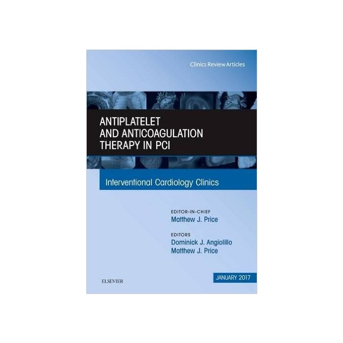 This issue of Interventional Cardiology Clinics, edited by Drs. Dominick Angiolillo and Matthew Price, will focus on Antiplatelet and Anticoagulation Therapy in PCI. The topics covered in this volume will span across pretreatment with antiplatelet agents; optimal duration of antiplatelet therapy after PCI; Cangrelor and its role in percutaneous coronary intervention; Ticagrelor and its effects beyond the P2Y12 receptor; dyspnea and Reversibly-binding P2Y12 antagonists; PAR receptor inhibition post-PCI; switching P2Y12 receptor inhibiting therapies; antiplatelet and antithrombotic therapy in patients with atrial fibrillation undergoing coronary stenting; antithrombotic therapy to reduce ischemic events in ACS patients undergoing PCI; and the current role of platelet function testing in PCI and CABG, among other topics.
