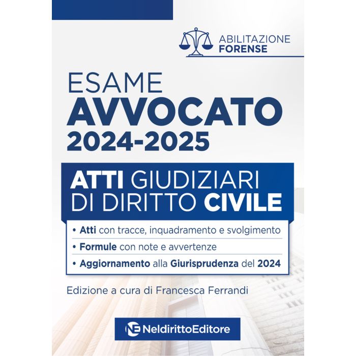 Dopo anni segnati dal sistema del c.d. orale rafforzato, è stata ripristinata per l'esame di Stato per l'abilitazione alla professione di avvocato la sessione scritta, consistente nella redazione di un atto giudiziario. La prova orale, invece, è articolata in più fasi di cui la prima consiste nella soluzione di un caso. Il Volume Atti di diritto civile è stato pensato e realizzato per venire incontro alle specifiche esigenze di chi deve preparare la prova scritta, ma anche la prima fase della prova orale. Il volume è suddiviso in due Parti. Nella prima Parte (Gli Atti) sono esaminati 29 Casi tratti dalla più importante giurisprudenza anche del 2024. Ciascun caso presenta la seguente struttura: analisi della traccia; inquadramento delle questioni giuridiche pertinenti; atto svolto. L'obiettivo è fornire le tecniche necessarie per dare una corretta impostazione all'elaborato, partendo da una ragionata analisi della traccia, passando dalla messa a fuoco degli aspetti rilevanti e dalla disamina delle questioni di diritto involte, per giungere, quindi, alla redazione dell'atto processuale. Oltre che per la prova scritta, questa prima Parte del Volume è utile anche per sostenere la prima fase della prova orale, consistente nella soluzione di un caso. Nella seconda Parte del Volume (Le Formule) sono inserite 50 Formule processuali, selezionate tra quelle più ricorrenti e importanti, quindi ad alta probabilità d'esame. Quanto alla struttura, per ciascuna formula sono indicate, con un articolato apparato di note, le avvertenze di cui tener conto in sede di redazione dell'atto.