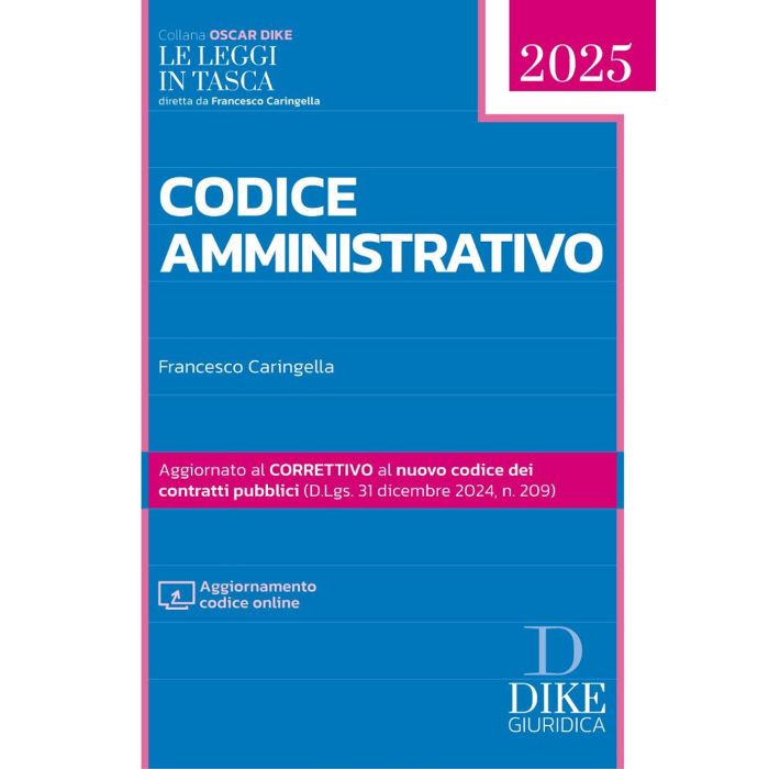 Il codice, in un comodo formato tascabile tutte le leggi fondamentali del diritto amministrativo ed è molto utile per le prove dei diversi concorsi nelle PP.AA. e nelle forze dell'ordine in corso di svolgimento. In questa edizione è stato ampliato con nuove parti normative relative a Concorrenza e mercato, Concessioni demaniali marittime, Contabilità e finanza. Aggiornato a D.Lgs. 31 dicembre 2024, n. 209 (c.d. correttivo al codice dei contratti pubblici) L. 30 dicembre 2024, n. 207 (legge di bilancio 2025) D.L. 27 dicembre 2024, n. 202 (c.d. decreto milleproroghe) D.L. 27 dicembre 2024, n. 201 (c.d. decreto cultura) L. 13 dicembre 2024, n. 191, conv. D.L. 153/2024 (cd decreto ambiente) L. 9 dicembre 2024, n. 187, conv. D.L. 145/2024 (c.d. decreto flussi) Contiene disposizioni in tema di: Ambiente, Anticorruzione, Autonomie locali, Azione amministrativa, Beni culturali, Concorrenza e mercato, Concessioni demaniali marittime, Contabilità e finanza, Contratti pubblici, Edilizia, Espropriazione, Giustizia amministrativa, Pubblico impiego, Riorganizzazione delle pubbliche amministrazioni, Sanzioni amministrative, SCIA, Semplificazioni, Servizi pubblici, Società partecipate, Spese di Giustizia, Trasparenza amministrativa.