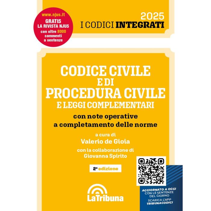Questo nuovo Codice civile e di procedura civile e leggi complementari con note operative a completamento delle norme si inserisce nella collana dei Codici Integrati, che rappresenta una novità nel panorama editoriale. Le norme pubblicate sono integrate da utilissime note operative che ne completano la portata applicativa alla luce dell'interpretazione delle più rilevanti pronunce delle Corti Superiori (con indicazione, ove presenti, degli orientamenti conformi e difformi), così da rispondere pienamente alle quotidiane esigenze professionali di avvocati e magistrati. Il volume è aggiornato con il correttivo alla riforma Cartabia del processo civile (Decreto Legislativo 31 ottobre 2024), n. 164). L'opera contiene i testi dei principali articoli previgenti al correttivo, in modo di fornire al lettore un più agevole quadro dell'evoluzione normativa. L'accesso gratuito alla Rivista digitale NJUS - La giurisprudenza spiegata in tempo reale, e la APP TRIBUNACODICI consentono di conoscere immediatamente le sentenze del giorno e le novità normative e giurisprudenziali per un costante ed immediato aggiornamento in materia di diritto civile e processuale civile.