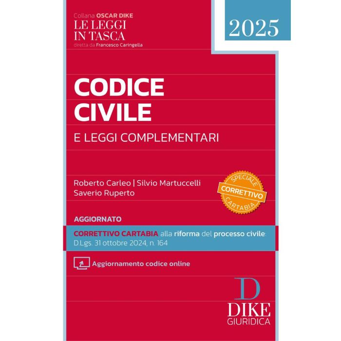 Il codice è Aggiornato L. 14 novembre 2024, n. 166, conv. D.L. 131/2024, cd decreto salva infrazioni L. 4 novembre 2024, n. 169, in tema di reato di surrogazione di maternità D.Lgs. 31 ottobre 2024, n. 164, cd correttivo Cartabia alla riforma del processo civile corredato dalle principali leggi complementari in tema di Adozione, Banca, Consenso Informato, Consumatori, Crisi di Impresa, Diritto d'autore, Diritto internazionale privato, Divorzio, Fallimento e altre procedure concorsuali, Famiglia, Finanza, Leasing, Locazioni, Privacy, Procreazione medicalmente assistita, Rent to buy, Sovraindebitamento, Subfornitura delle attività produttive, Testamento biologico, Unioni civili e convivenza.