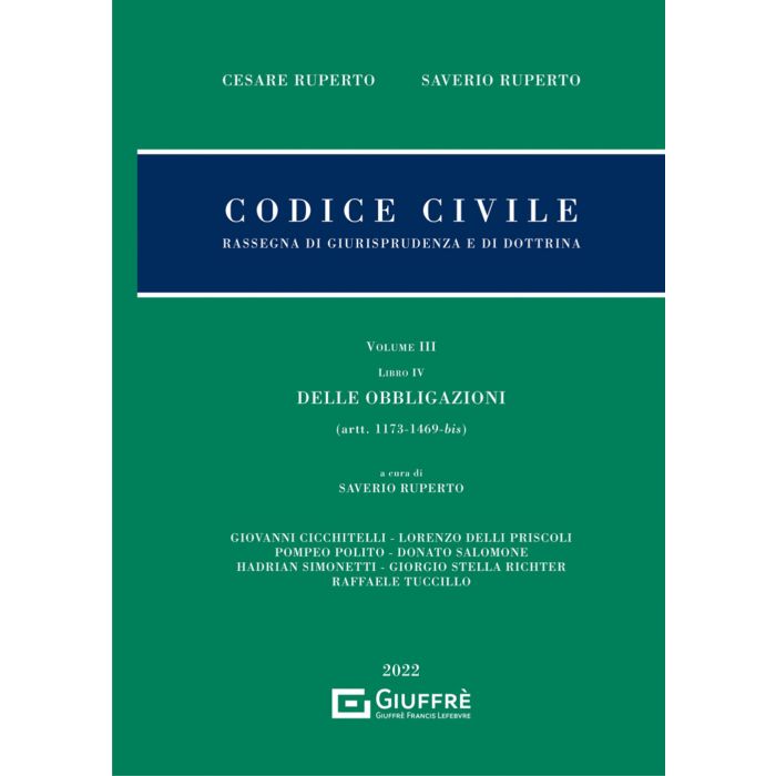Il "Codice civile. Rassegna di giurisprudenza e di dottrina" si presenta in una edizione rinnovata sia nello sviluppo della trattazione - che si svolge in 6 volumi - che nella squadra di Autori di cui si avvale selezionati tra i più autorevoli magistrati accademici e avvocati guidati da Saverio Ruperto che si affianca alla storica direzione di Cesare Ruperto. Un'esposizione ragionata della giurisprudenza sul codice civile sulla base della tradizionale struttura che vede gli articoli del codice corredati da proprie bibliografie atte a segnalare al lettore i maggiori titoli di riferimento per approfondire le tesi dottrinali specifiche e sommari numerati per individuare i singoli argomenti trattati il tutto dettagliato in precisi indici analitici allestiti per ciascun volume. Mantenendo l'originaria impostazione di raccolta di massime tratte dalle decisioni più significative della Corte Suprema e dei giudici di merito in un confronto costante con l'interpretazione dottrinale che non svolge ruolo secondario nell'applicazione del diritto la Rassegna segnala i contrasti in atto e le soluzioni delle Sezioni Unite della Corte di cassazione esponendo l'indirizzo attuale sulle singole questioni e citando le riviste in cui le sentenze risultano pubblicate precisando le eventuali note a sentenza come conformi o contrarie all'indirizzo esposto. La disciplina sostanziale è puntualmente aggiornata agli interventi legislativi che negli anni si sono susseguiti fino alle più recenti novità tra cui la riforma che prevede l'ampliamento della competenza del Giudice di Pace che acquisirà efficacia a partire dal 31 ottobre 2025 (d.lgs. 13 luglio 2017 n. 116 da ultimo modificato dal d.l. 30 dicembre 2019 n. 162 conv. con modif. in l. 28 febbraio 2020 n. 8); le modifiche in materia di corruzione tra privati (ai sensi della l. 9 gennaio 2019 n. 3); l'incidenza delle misure adottate dal Governo durante l'emergenza epidemiologica da Covid-19; la nuova disciplina sulla crisi d'impresa (dal d.lgs. n. 14/2019 passando per l'emanazione del correttivo d.lgs. 26 ottobre 2020 n. 147 fino all'ultimo d.l. n. 118 del 24 agosto 2021 che ne rinvia l'entrata in vigore al 2022).L'Opera affiancata da una versione digitale che permetterà di riceverne l'aggiornamento on-line dopo la pubblicazione è così suddivisa: Volume I. Disposizioni sulla legge in generale e Libro I - Delle persone e della famiglia (artt. 1-455).Volume II. Libro II - Delle successioni (artt. 456-809) e Libro III - Della proprietà (artt. 810-1172).Volume III. Libro IV - Delle obbligazioni (artt. 1173-1469-bis).Volume IV. Libro IV - Delle obbligazioni (artt. 1470-2059).Volume V. Libro V - Del lavoro (artt. 20260-2554).Volume VI. Libro V - Del lavoro (artt. 2555-2642) e Libro VI - Della tutela dei diritti (artt. 2643-2969).