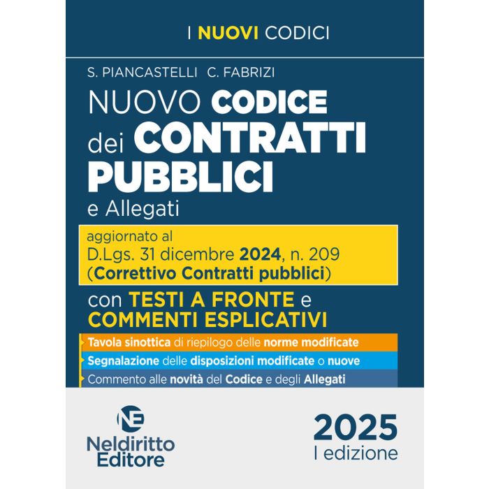Con l'obiettivo di razionalizzare e ulteriormente semplificare la disciplina vigente, anche in recepimento delle affermazioni giurisprudenziali e delle criticità sollevate dall'Anac, il D.lgs. 31 dicembre 2024, n. 209c.d.CorrettivoContratti Pubblici è intervenuto a modificare in maniera significativa il Codice dei contratti pubblici(D.lgs. 31 marzo 2023, n. 36)e i relativi Allegati, con puntuali commenti esplicativi delle novità . Il Volume Nuovo Codice dei Contratti pubblici, con testi a fronte e commenti esplicativi, 2025, Neldiritto Editore, rivolto a avvocati, magistrati, studiosi e operatori del settore, consente di visualizzare in modo chiaro e immediato tutte le novità introdotte dal Correttivo al D.lgs. 31 marzo 2023, n. 36.Il Codice è articolato in due Parti. La prima, reca per intero il Codice dei contratti pubblici come modificato dalla riforma del 2024. Il Volume contiene: testi a raffronto con evidenziazione delle modifiche apportate; puntuali e sistematici commenti esplicativi delle innovazioni; segnalazione delle disposizioni introdotte ex novo; apposita tavola sinottica, posta in apertura della prima Parte, recante un riepilogo di tutte le disposizioni modificate, utilissima per avere immediata contezza delle novità . La seconda Parte dà invece conto delle modifiche introdotte dal D.lgs. 31 dicembre 2024, n. 209agliAllegati.Completa il Volume l'Indice analitico.