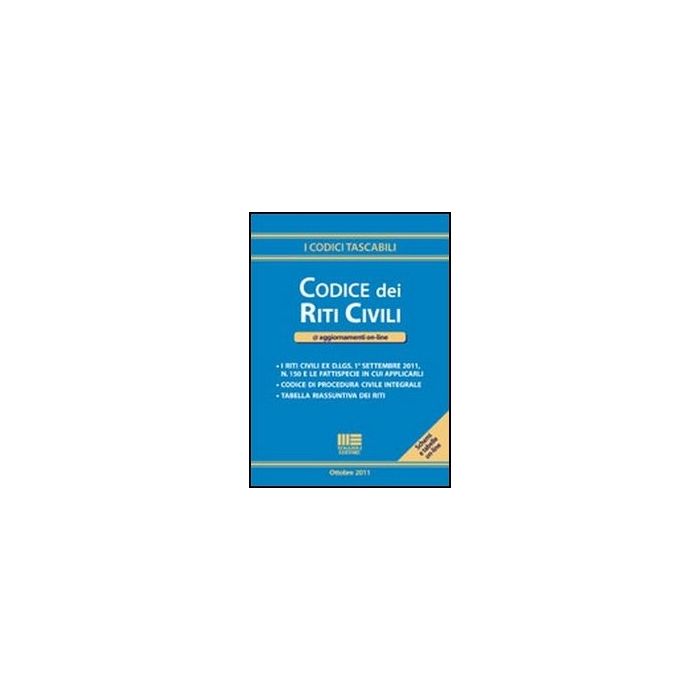 Il d. Lgs. 1° settembre 2011, n. 150 (g. U. 21 settembre 2011, n. 220) ha operato una sostanziale riduzione e semplificazione dei procedimenti civili. Il presente codice è articolato in tre parti, che ripercorrono i tre riti previsti: rito ordinario di cognizione, rito del lavoro, rito sommario di cognizione. In appendice sono poi riportati integralmente il codice di procedura civile e le disposizioni di attuazione, cui sono collegati schemi e tabelle e un servizio di aggiornamento on-line, disponibili al sito www. Moduli. Maggioli. It.