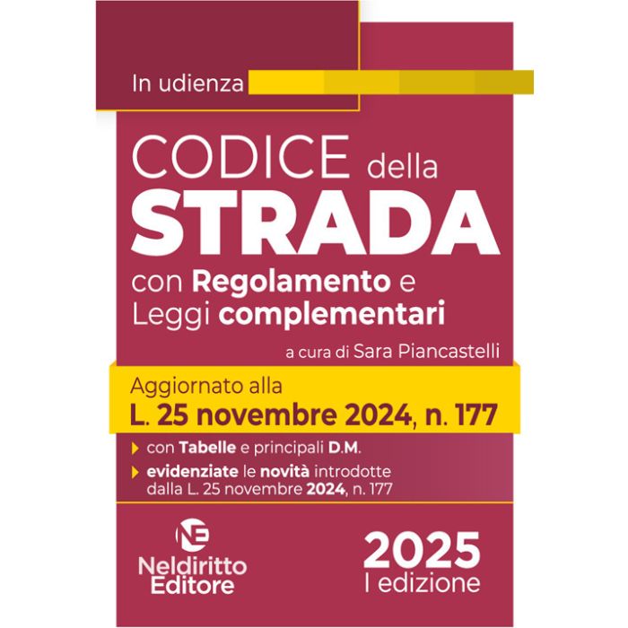 Con l'obiettivo di ridurre gli elevati livelli di incidentalità, la L. 25 novembre 2024, n. 177 è intervenuta a modificare in maniera significativa il Codice della Strada(D.lgs. 285/1992)e il Regolamento di esecuzione e attuazione, configurando un'articolata struttura di misure di prevenzione e di sanzioni. Il Codice della Strada con Regolamento e Leggi complementari, Neldiritto Editore, rivolto a avvocati, magistrati, studiosi, consente di visualizzare in modo chiaro e immediato tutte le novità introdotte dallaL.25novembre2024,n.177.Il Volume, con formato pocket, contiene la Costituzione e reca per intero il nuovo Codice della Strada e il relativo Regolamento di Esecuzione e attuazione. Il Volume contiene inoltre :una snella ma al contempo ragionata selezione di Leggi complementari, articolate in apposite voci, come modificate dallaL.25novembre2024,n.177;letabelleeiprincipali D.M.,utilissimi per tutti gli operatori del settore. Completano l'Opera l'Indice cronologico e un corposo Indice analitico.