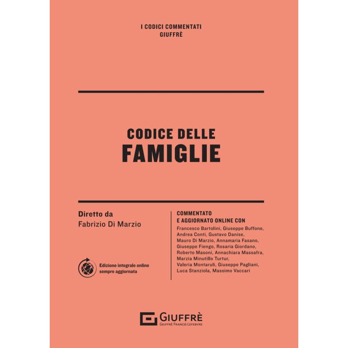 Il Codice commentato delle famiglie 2024 - diretto da Fabrizio Di Marzio, giunto alla III edizione, si inserisce nella collana I Codici Commentati Giuffrè, che abbinano efficacemente la consultazione cartacea alla versione aggiornata on line grazie all'integrazione dei contenuti all'interno del network Giuffrè Francis Lefebvre, che offre: firme autorevoli che guidano il professionista verso la comprensione e l'analisi degli argomenti organizzazione sintetica e ordinata dei contenuti che privilegia la rapidità di individuazione dell'informazione casistica selezionata che dà conto dei più rilevanti orientamenti giurisprudenziali aggiornamento continuo online, che dà conto delle principali modifiche normative e giurisprudenziali, disponibile all'interno dei prodotti online Giuffrè Francis Lefebvre. L'opera è aggiornata alla legge n. 193 del 2023 (Diritto all'oblio oncologico) e alla Riforma varata con il d.lgs. n. 149/2022 (c.d. Cartabia), che ha introdotto, nel secondo libro del codice di procedura civile, un rito unitario per le persone, le famiglie e i minori con la possibilità di proporre, tra l'altro, con un solo ricorso la separazione e il divorzio e aggiunge, rispetto alla precedente edizione, un nuovo argomento dedicato al processo minorile oltre al consolidamento della Legge n. 206 del 2021 e del Regolamento UE n. 1111/2019. Il volume si completa con l'indicazione precisa e dettagliata delle Formule correlate, rinvenibili nella nuova edizione del Formulario delle Famiglie. Tutto costantemente aggiornato all'interno del modulo Codici commentati on line in DeJure (www.dejure.it) e nel nuovo portale delle materie giuridiche IUS (ius.giuffrefl.it.)