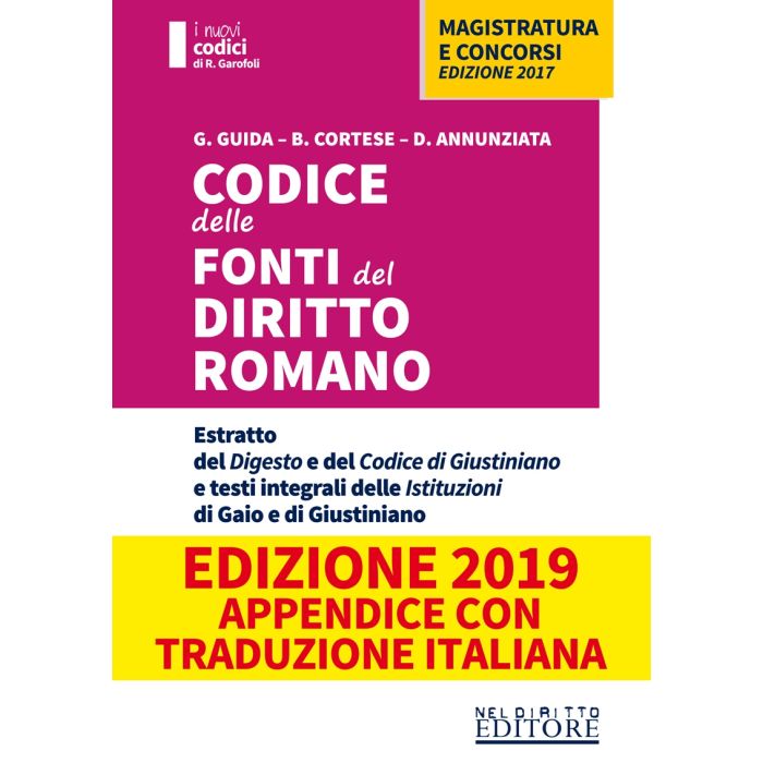 Il Codice è un innovativo strumento di consultazione delle principali fonti di diritto romano, utile a ricostruire la disciplina romanistica dei principali istituti di diritto privato e a cogliere facilmente il collegamento tra le stesse e le vigenti disposizioni civilistiche dell'ordinamento italiano. Sono riportati, in estratto, i testi dei Digesta e del Codex di Giustiniano e, nella versione integrale, le Istituzioni di Gaio e di Giustiniano, privi di traduzioni, annotazioni o commenti.