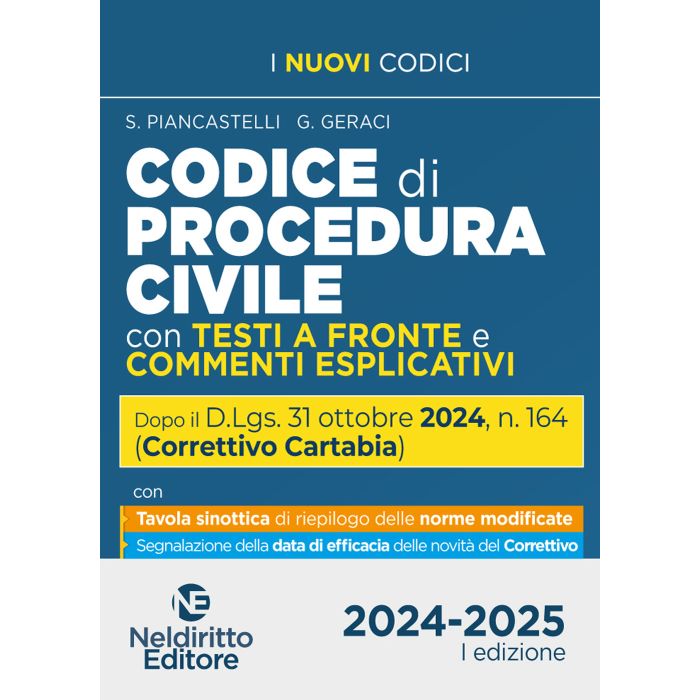 A due anni dalla Riforma Cartabia (D.Lgs. 10 ottobre 2022, n. 149), il Decreto Correttivo del 2024 ha profondamente modificato il sistema processuale. Il volume Codice di procedura civile dopo il Decreto correttivo Cartabia, Neldiritto Editore, rivolto a avvocati, magistrati, studiosi, consente di visualizzare in modo chiaro e immediato tutte le novità introdotte dal Decreto Correttivo Cartabia. Il Volume si articola in due Parti. La prima reca per intero il Codice di procedura civile e le Disposizioni di attuazione. Il volume contiene: testi a fronte con evidenziazione delle modifiche apportate; puntuali e sistematici commenti esplicativi delle innovazioni; apposita tavola sinottica, posta in apertura della prima Parte, recante un riepilogo di tutte le disposizioni modificate, utilissimo, per avere immediata contezza delle novità, di cui è così resa agevole la ricerca; Segnalazione della data di efficacia delle novità del Correttivo. La seconda Parte, articolata in più Sezioni, dà invece conto delle modifiche introdotte dal Decreto Correttivo Cartabia al codice civile, e alle Leggi complementari.