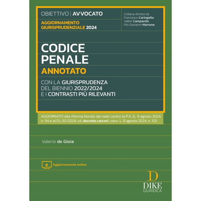Il Codice è annotato con le massime della giurisprudenza di legittimità pone una particolare attenzione alle pronunce più importanti e significative dell'ultimo biennio evidenzia le questioni oggetto di contrasto con l'indicazione dell'orientamento difforme o parzialmente difforme fa precedere le tematiche di assoluta attualità da una o più massime di carattere generale che descrivono l'istituto rappresenta un indispensabile strumento per la prova scritta dell'esame di abilitazione forense, nonché per la prima fase della successiva prova orale consistente nella discussione di una questione pratico-applicativa, costituisce un utile sussidio di aggiornamento dei tradizionali codici contiene una sapiente selezione delle tematiche che maggiormente possono essere oggetto di traccia o del caso da risolvere è necessario non solo per l'esame di avvocato, ma anche per gli operatori del settore: avvocati e magistrati riporta un dettagliato indice analitico che consente una rapida individuazione delle questioni è aggiornato alla riforma Nordio dei reati contro la PA (L. 9 agosto 2024, n. 114 e al D.L.92/2024, cd decreto carceri, conv. L. 8 agosto 2024, n. 112) grazie all'aggiornamento online sarà aggiornato da tutte le norme e le principali decisioni che dovessero sopravvenire fino a giugno 2025