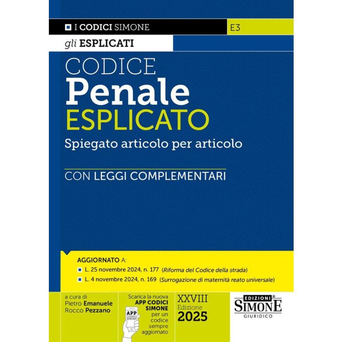 Questa nuova edizione del Codice penale Esplicato viene data alle stampe aggiornata alla riforma Nordio del 2024 che ha abrogato l'abuso d'ufficio e modificato il traffico di influenze illecite. Come tutti i Codici della Collana Esplicati, anche questo avvicina gli studenti universitari alla lettura e alla comprensione della norma, fornendo gli strumenti necessari per individuare i principali istituti del diritto processuale e per sviluppare gli opportuni collegamenti tra gli stessi. A tal fine, questo Codice si avvale di originali apparati grafici e di commento tra i quali: l'uso di caratteri chiari e leggibili per una lettura più scorrevole; opportune definizioni, evidenziate in grassetto nel testo, che agevolano la comprensione dell'articolo; note esplicative a completamento dell'analisi del testo normativo; riquadri di approfondimento, riportati su fondo grigio, per individuare la ratio dei singoli articoli; una selezione di norme complementari a integrazione della disciplina codicistica. Punto di forza del Codice è rappresentato dall'indice analitico-alfabetico che, accanto a un puntuale indice cronologico, agevola la ricerca e la comprensione delle norme. Per come è strutturato, il Codice penale Esplicato risulta uno strumento di studio indispensabile per gli studenti universitari, ma anche per praticanti avvocati e per i partecipanti ai concorsi pubblici. La presente edizione tiene conto anche delle novità introdotte dal D.Lgs. 31/2024 (cd. Correttivo Cartabia) e dalla L. 90/2024 (Cybersicurezza). Novità di quest'anno è l'AppCodiciSimone, che consente di consultare il codice dallo smartphone e di averlo sempre aggiornato in tempo reale. L'App è disponibile sia per dispositivi Android che iOS ed è scaricabile gratuitamente attraverso il QR in calce a questo Codice.