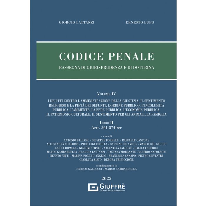 La nuova edizione del Codice di penale. Rassegna di giurisprudenza e di dottrina, si presenta in una veste più agile, in sei volumi, e al contempo rinnovata nei contenuti, per coniugare l'elevato spessore della trattazione con una vocazione pratica, grazie alla consolidata autorevolezza dei Direttori, G. Lattanzi ed E. Lupo, nonché degli autori, scelti tra esperti magistrati, accademici e avvocati. L'opera offre un quadro completo della disciplina sostanziale aggiornata e integrata sotto il profilo giurisprudenziale e dottrinale, con un'attenzione mirata alle questioni più attuali, lette alla luce dei copiosi interventi legislativi degli ultimi anni e alle più recenti novità che hanno modificato in profondità istituti con rilevanti ricadute anche per la pratica giudiziaria. Tra gli interventi legislativi più significativi - oltre alla "Riforma Cartabia" (l. n. 134/2021) - con particolare riferimento alle norme contenute nel presente Volume IV: la recentissima l. n. 22 del 2022, di riforma dei reati contro il patrimonio culturale, gli interventi in tema di lotta contro le frodi e le falsificazioni di mezzi di pagamento diversi dai contanti (d.lg. n. 184 /2021), le novità in tema di incendio boschivo (d.l. n. 120/2021, conv. in l. n. 155/2021), le modifiche sul contrasto all'introduzione e all'utilizzo di dispositivi di comunicazione in carcere (d.l. n. 130/2020, conv. in l. n. 173/2020), la riformulazione del reato di scambio elettorale politico-mafioso (l. n. 43/2019), nonché gli interventi a tutela delle vittime della violenza (l. n. 69/2019, c.d. Codice Rosso) e l'attuazione del principio della "riserva di codice penale" (d.lg. n. 21/2018). Grazie all'esposizione sistematica e ragionata, la Rassegna offre un'informazione completa sul significato delle disposizioni del codice e sugli orientamenti giurisprudenziali, mettendo in evidenza i contrasti e le soluzioni delle Sezioni Unite, le opinioni dottrinali più autorevoli. L'opera è così suddivisa: I. La legge penale, le pene e il reato (artt. 1-84); II. Il reo e la persona offesa dal reato, la non punibilità per particolare tenuità del fatto, la modificazione, applicazione ed esecuzione della pena, l'estinzione del reato e della pena, le sanzioni civili e le misure amministrative di sicurezza (artt. 85-240-bis); III. I delitti contro la personalità dello Stato e i delitti contro la pubblica amministrazione (artt. 241-360); IV. I delitti contro: l'amministrazione della giustizia, il sentimento religioso e la pietà dei defunti, l'ordine pubblico, l'incolumità pubblica, l'ambiente, la fede pubblica, l'economia pubblica, il patrimonio culturale, il sentimento per gli animali, la famiglia (artt. 361-574-ter); V. I delitti contro la persona e i delitti contro il patrimonio (artt. 575-649-bis); VI. Le contravvenzioni (artt. 650-734-bis) Naviga nella versione digitale e scopri come ricevere l'aggiornamento on line. Rivolgiti al tuo Agente GFL di fiducia o alle migliori librerie professionali