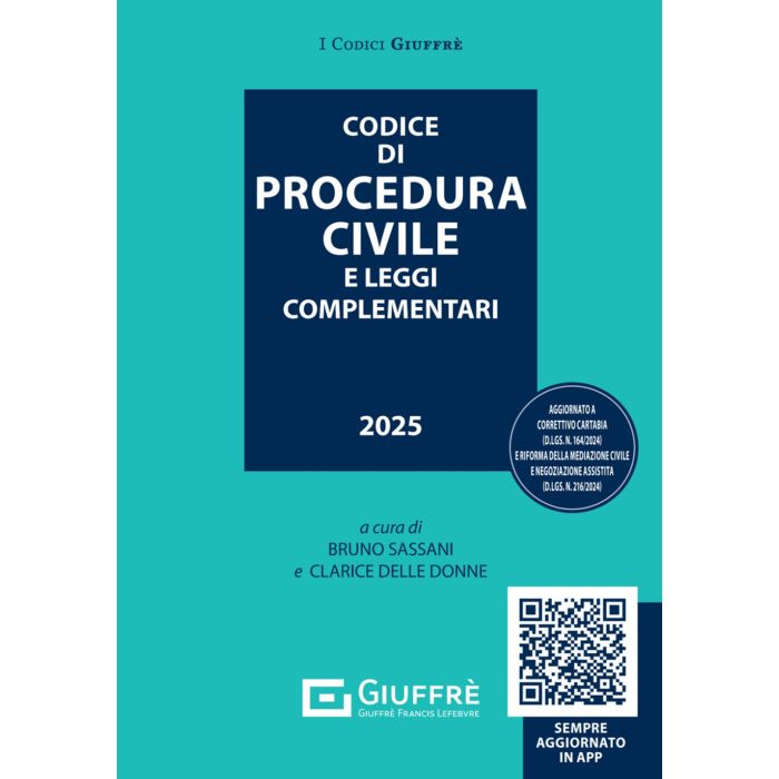 La nuova edizione 2025 del Codice di procedura civile e Leggi complementari è aggiornata alle seguenti novità: Legge di bilancio 2025 (L. 30 dicembre 2024, n. 207); Nuove disposizioni in materia di lavoro (L. 30 dicembre 2024, n. 203); Nuove disposizioni in materia di mediazione civile e commerciale e negoziazione assistita (D.lgs. 27 dicembre 2024, n. 216); Decreto "giustizia" (D.l. 29 novembre 2024, n. 178); Correttivo alla riforma Cartabia del processo civile (D.lgs. 31 ottobre 2024, n. 164); Correttivo-ter al Codice della crisi d'impresa e dell'insolvenza (D.lgs. 13 settembre 2024, n. 136); Decreto PNRR (L. 29 aprile 2024, n. 56, di conversione del d.l. n. 19/2024). Le disposizioni del Codice civile e delle leggi complementari, nel cui elenco si annoverano i recenti stralci rilevanti per ciascuna voce, sono annotate con i testi previgenti delle norme di più recente emanazione e con specifici richiami alla normativa correlata. L'indice analitico e l'indice cronologico, che completano il volume, permettono di reperire rapidamente gli argomenti e le norme di interesse, nonché le modifiche intervenute e le correlazioni tra le stesse. Gli aggiornamenti che interverranno successivamente alla pubblicazione saranno consultabili in App, inquadrando il QR-Code presente in copertina.