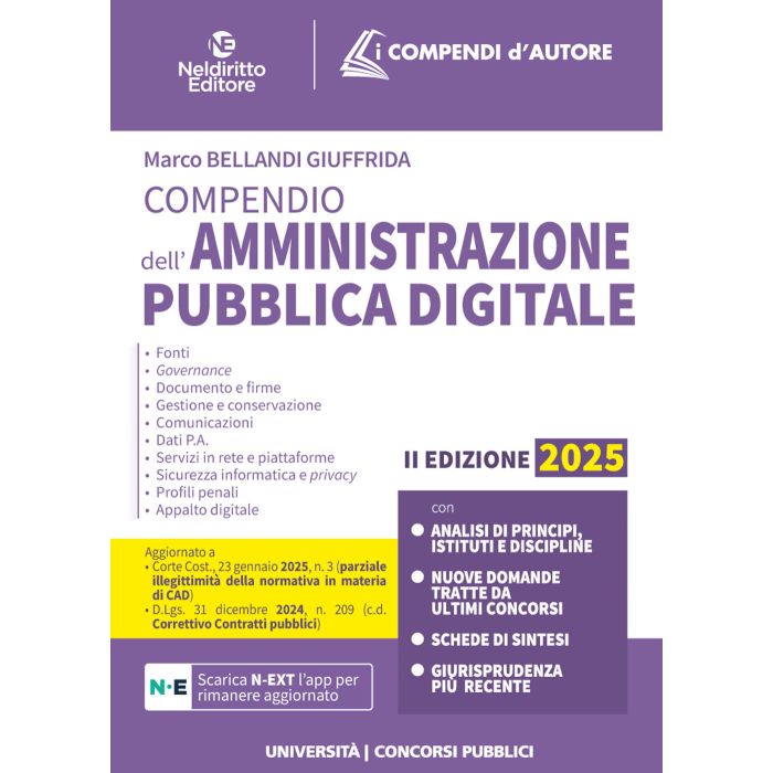 Il volume si inserisce nella collana I Compendi d'Autore, ideata e strutturata appositamente per tutti coloro che si apprestano alla preparazione degli esami orali per l'università e per le prove dei principali concorsi pubblici. L'Opera è frutto di una felice combinazione tra gli aspetti caratteristici, da un lato, della tradizionale trattazione manualistica, di cui conserva la struttura e l'essenziale impostazione nozionistica, e, dall'altro, della più moderna trattazione "per compendio", di cui fa proprie la capacità di sintesi e la schematicità nell'analisi degli istituti giuridici con particolare riguardo agli aspetti pratici ed alle conseguenze concrete. A tal fine, le direttrici lungo cui si è sviluppata la collana sono state chiarezza nella forma e completezza nella sostanza. Il Compendio dell'Amministrazione Digitale, NelDiritto Editore 2025, offre una ricognizione delle indicazioni e delle nuove strategie europee e nazionali in materia di digitalizzazione e innovazione della pubblica amministrazione, anche in attuazione dei progetti del PNRR per la transizione digitale della PA. In particolare, il Compendio tiene conto: del Piano Triennale per l'Informatica nella Pubblica Amministrazione 2024-2026; del Digital Compass2030 (Bussola digitale per l'Europa); della Strategia Nazionale di Cyber sicurezza 2022 - 2026; della L. 28 giugno2024, n. 90 (Cyber sicurezza e reati informatici) del Regolamento e IDAS 2.0 (UE) 2024/1183.Numerosi spunti sono tratti dalle più significative pronunce della giurisprudenza, tra cui si segnala Corte Cost., 23 gennaio 2025, n. 3 in punto di parziale illegittimità della normativa in materia di CAD. Completa l'Opera un corposo Indice analitico.