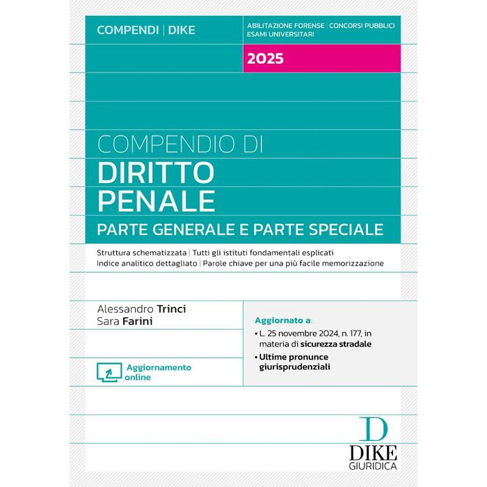 Il compendio illustra in modo compiuto gli istituti del diritto penale contiene le questioni più rilevanti che, con maggiore probabilità, potranno essere considerate dalle commissioni di concorso in questa nuovissima edizione è stato profondamente rivisto e ampliato è impreziosito da puntuali box di approfondimento e schemi riepilogativi è aggiornatissimo alle ultime novità normative: L. 25 novembre 2024, n. 177, in materia di sicurezza stradale Più recente giurisprudenza.