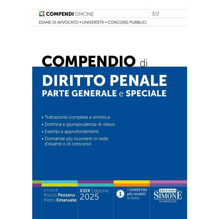Anche questa XXIX edizione del Compendio di Diritto Penale presenta l'originale struttura e impianto grafico che caratterizzano i nuovi Compendi Simone. Il linguaggio utilizzato è semplice e immediato e gli istituti fondamentali della disciplina sono esaminati a partire dalla loro definizione, al fine di individuare subito il primo dato indispensabile per proseguire lo studio. Nell'esposizione degli argomenti sono stati utilizzati tre elementi didattici, messi in evidenza con diversi corpi di stampa e con apposite icone. In tal modo sono evidenziati gli approfondimenti, per chi intende esaminare e comprendere maggiormente un tema, gli esempi, che consentono di chiarire un concetto, e le differenze, per definire i tratti caratteristici di un istituto in rapporto con altri simili. Per garantire una conoscenza esaustiva della materia sono poi riassunti, in appositi box con fondino, gli orientamenti più rilevanti di dottrina e giurisprudenza. Là dove realmente necessario viene evidenziato, sempre in box, il riferimento normativo indispensabile per lo studio. In chiusura di ogni capitolo, infine, sono riportate le domande più ricorrenti in sede di esame o di concorso, in modo da verificare immediatamente il livello di preparazione raggiunto. Come sempre, nei Compendi Simone un occhio attento è riservato alle tematiche di stretta attualità e alle più recenti novità legislative, fra cui la L. 25 novembre 2024, n. 177 (Riforma del Codice della strada). Per tali caratteristiche, il nuovo Compendio di Diritto Penale costituisce uno strumento di studio indispensabile per chi intende sostenere l'esame di avvocato, un concorso pubblico o un esame universitario.