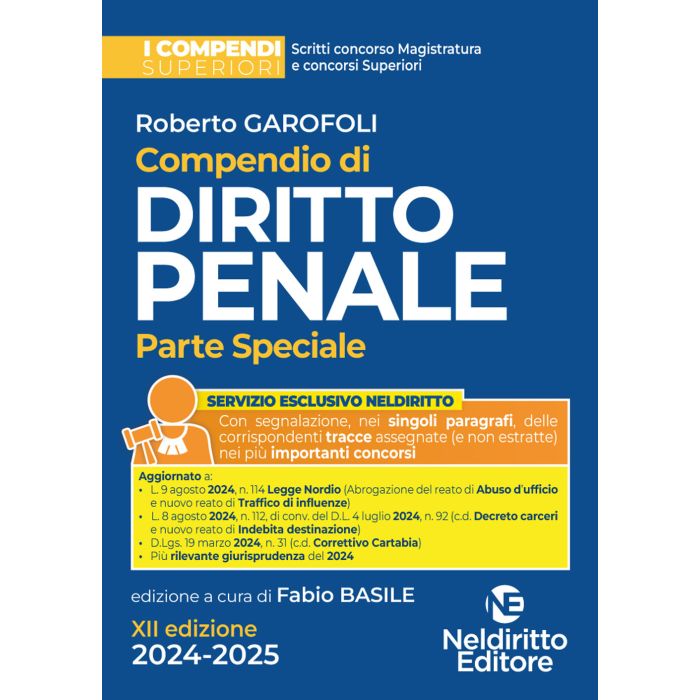 La collana "I Compendi Superiori" è stata ideata per affiancare agli apprezzatissimi e ormai consolidati "Manuali Superiori" volumi più sintetici e compatti. La Collana è pensata appositamente per tutti coloro che si apprestano alla preparazione delle prove scritte del concorso in magistratura e dei principali concorsi pubblici. L'idea di fondo è quella di assicurare - con volumi snelli e sintetici ma puntualmente completi - una preparazione solida, mediante la trattazione non solo degli istituti ma anche delle correlate elaborazioni e tesi dottrinali e giurisprudenziali, riportate in modo schematico. I Compendi si connotano per: chiarezza nell'espressione, semplice ma al contempo attenta all'eleganza formale; completezza della trattazione, unita ad un'efficace sintesi espositiva; illustrazione schematica "per punti" delle principali tesi emerse sulle questioni maggiormente controverse e dibattute; attenta selezione della più significativa giurisprudenza. Completa il volume un corposo indice analitico-alfabetico, appositamente strutturato in modo da consentire un'agevole e pronta ricerca degli istituti e dei problemi ad essi relativi. Per agevolare la preparazione, dopo la trattazione degli istituti sono indicate tracce elaborate tenendo conto del dibattito più recente e, quindi, ad alta probabilità concorsuale. Completa il volume un corposo indice analitico-alfabetico, utile per la ricerca degli istituti e dei problemi. In questa dodicesima Edizione il Compendio superiore di diritto penale, Parte speciale, è stato profondamente aggiornato. L'Edizione è stata come di consueto aggiornata in primo luogo alle più importanti novità legislative intervenute, tra cui quelle in tema di: abrogazione del reato di abuso d'ufficio e nuovo reato di traffico di influenze illecite (L. 9 agosto 2024, n. 114 c.d. Legge Nordio); nuovo reato di indebita destinazione di denaro e altre cose mobili (L. 8 agosto 2024, n. 112, di conv. del D.L. 4 luglio 2024, n. 92 c.d. Decreto Carceri); omesso versa- mento Iva (D. Lgs. 14 giugno 2024, n. 87). Tra le numerose novità giurisprudenziali prese in esame, segnaliamo in particolare quelle in materia di: aiuto al suicidio (Corte Cost., 18 luglio 2024, n. 135); profili successori del reato di falso in bilancio (Cass. Pen., Sez. V, 19 giugno 2024, n. 37264); elemento soggettivo dell'omicidio preterintenzionale (Cass. Pen., Sez. II, 2 maggio 2024, n. 23926); rapina di "lieve entità" (Corte Cost., 13 maggio 2024, n. 86); bancarotta fraudo- lenta impropria (Cass. Pen., Sez. IV, 3 aprile 2024, n. 19207); identità digitale e frode informatica (Cass. Pen., Sez. II, 13 marzo 2024, n. 13559); rapporti tra i delitti di traffico di influenze illecite e di millantato credito (Cass. Pen., Sez. un. 29 febbraio 2024, n. 19357); violazione degli obblighi di assistenza familiare (Cass. Pen., Sez. VI, 8 febbraio 2024, n. 14025); stupefacenti e destinazione dello "spaccio" (Cass. Pen., Sez. IV, 1° febbraio 2024, n. 14690); attenuante del contributo di minima importanza, di cui all'art. 609-octies, co. 4, c.p. (Cass. Pen., Sez. IV, 24 gennaio 2024, n. 10649); indebita compensazione (Cass., 23 gennaio 2024, n. 2779); regime di procedibilità delle lesioni personali dolose dopo la riforma Cartabia (Cass. Pen., Sez. un. 14 dicembre 2023, n. 12759).