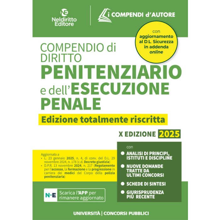 Il Compendio di Diritto Penitenziario e dell'esecuzione penale, Neldiritto Editore 2025, si articola in quattro parti: la prima contiene una ricostruzione del sistema sanzionatorio nazionale e della fase di esecuzione della pena; la seconda si sofferma sulle fonti e la normativa penitenziaria; la terza è dedicata all'ordinamento penitenziario, con peculiare attenzione agli organi, all'Amministrazione, al personale, agli istituti, al regime e al trattamento penitenziario; la quarta, infine, esamina l'ordinamento penitenziario minorile. L'Opera tiene conto delle più importanti novità normative, tra cui si segnalano: L. 23 gennaio2025, n. 4, di conv. del D.L. 29 novembre 2024, n. 178 (c. d. Decreto giustizia); D.P.R.13 novembre 2024, n. 217, recante regolamento per l'accesso, la formazione e la progressione in carriera dei medici del Corpo della polizia penitenziaria; L.8 agosto2024, n. 112, di conv. del D. l. 4 luglio 2024, n. 92 (c.d. Decreto Carceri), intervenuta, tra l'altro, in tema di edilizia penitenziaria, regime di carcere duro e liberazione anticipata. Il Volume dà atto, inoltre, del c. d. D.d.l. Sicurezza, approvato dalla Camera dei deputati il 18 settembre 2024,recante disposizioni in materia di sicurezza pubblica, tutela del personale in servizio, vittime dell'usura e ordinamento penitenziario. Numerosi gli spunti tratti dal più significativo dibattito giurisprudenziale. Completa l'Opera l'indice analitico.