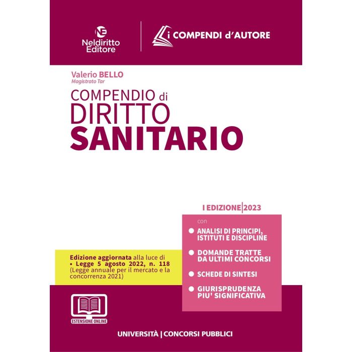 Il Compendio ricostruisce tutto il diritto sanitario, dando atto, in particolare, delle numerose e fondamentali novità introdotte dalla legge 5 agosto 2022, n. 118 (Legge annuale per il mercato e la concorrenza 2021) in materia di revisione e incremento della trasparenza dei criteri di accreditamento e di convenzionamento delle strutture private nonché del monitoraggio e la valutazione degli erogatori privati convenzionati, di rimborsabilità dei farmaci c.d. equivalenti, di revisione del sistema di produzione dei medicinali emoderivati da plasma italiano, di selezione della dirigenza sanitaria e di formazione manageriale in materia sanità pubblica, nonché delle più rilevanti questioni giurisprudenziali sorte attorno a tutti gli istituti trattati nel presente volume.