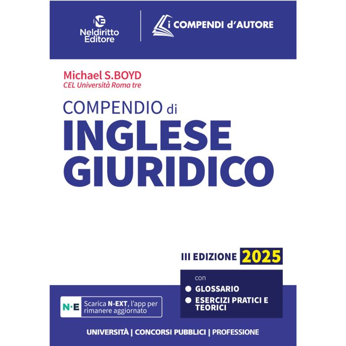 Il Compendio di Inglese Giuridico, Neldiritto Editore 2025, è il frutto di un lavoro attento, rigoroso e innovativo, rivolto a studenti universitari, linguisti e giuristi. Il Compendio è suddiviso in due Parti: la prima teorica, caratterizzata dallo studio dei testi all'interno di specifici contesti - i generi, la cui individuazione permette di isolare la realtà extralinguistica che condiziona la scelta e la comprensione del messaggio giuridico. Ne sono esempi il contesto processuale, quello relativo alla professione, o ancora alla legislazione e alle sentenze. Innovativa risulta, inoltre, l'applicazione dell'approccio della linguistica dei corpora per l'individuazione dei temi e delle ricorrenze nella lingua giuridica inglese; la seconda di carattere pratico, articolata in 14 unità didattiche, vengono trattati importanti profili e settori del diritto anglo-americano in continuo confronto con la tradizione di civil law. Le unità propongono esercizi nelle diverse abilità di apprendimento linguistico, inseriti in contesti che spaziano dalla procedura civile e penale al diritto dei contratti; dalla responsabilità civile al diritto dell'Unione (per citarne alcuni). La commistione tra teorie della linguistica, illustrazione di istituti di diritto anglo-americano e didattica della lingua, sia teorica che pratica, ne fanno uno strumento valido ed originale.