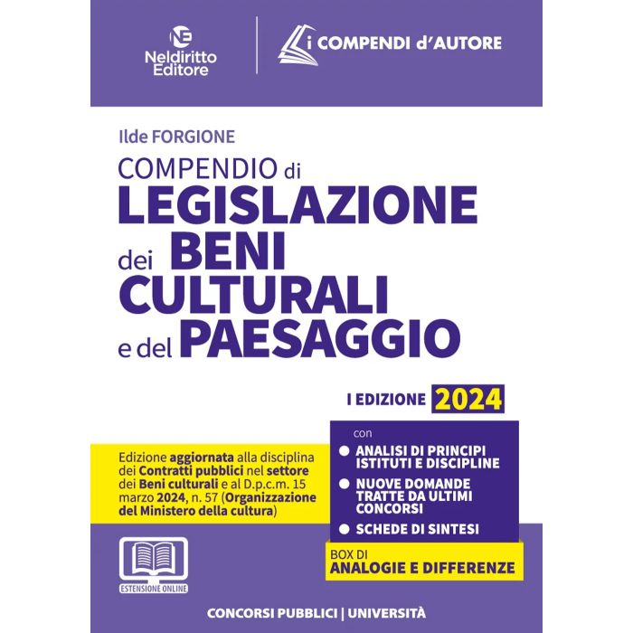Il volume si inserisce nella collana I Compendi d’Autore, ideata e strutturata appositamente per tutti coloro che si apprestano alla preparazione degli esami orali per l’università e per le prove dei principali concorsi pubblici. L’opera è frutto di una felice combinazione tra gli aspetti caratteristici, da un lato, della tradizionale trattazione manualistica, di cui conserva la struttura e l’essenziale impostazione nozionistica, e, dall’altro, della più moderna trattazione “per compendio”, di cui fa proprie la capacità di sintesi e la schematicità nell’analisi degli istituti giuridici con particolare riguardo agli aspetti pratici ed alle conseguenze concrete. Al contempo, si è avuto cura nell’evitare sia l’eccessivo appesantimento teorico e dogmatico della manualistica classica, sia l’estrema sintesi dei vecchi modelli di compendio, spesso “nemica” di un’agevole e chiara comprensione delle questioni trattate e quasi sempre causa di lacune nella preparazione. Ne è derivato un modello di “terza generazione” di testi per la preparazione alle prove d’esame, in cui l’imperativo è possedere tutte le conoscenze necessarie e sufficienti per raggiungere brillantemente l’obiettivo finale. A tal fine, le direttrici lungo cui si è sviluppata la collana sono state chiarezza nella forma e completezza nella sostanza. Nelle Edizioni 2024 la Collana è arricchita dall’inserimento di box di Analogie e differenze, utilissimi nella preparazione perché volti a mettere in evidenza gli elementi comuni e di distinzione tra Istituti affini. La tecnica utilizzata nei box rende di agevolissima fruizione, comprensione e memorizzazione aspetti talvolta non semplici e, tuttavia, essenziali delle discipline trattate. Il Compendio di Legislazione dei beni culturali e del paesaggio ricostruisce in maniera completa e accurata la disciplina nazionale e internazionale dei beni culturali e paesaggistici, tenendo conto delle più recenti novità normative, tra cui si segnalano quelle introdotte dal D.Lgs. 31 marzo 2023, n. 36 in materia di contratti nel settore dei beni culturali e dal D.p.c.m. 15 marzo 2024, n. 57 (in GU 3 maggio 2024) recante il regolamento di organizzazione del Ministero della cultura. Il Volume, arricchito da un’Appendice normativa online recante il testo aggiornato del Codice dei beni culturali e del paesaggio (D.lgs. 22 gennaio 2004, n. 42), rappresenta non solo un indispensabile strumento di preparazione per esami e concorsi ma anche un utilissimo supporto pratico, di consultazione e aggiornamento, per tutti gli operatori del settore.