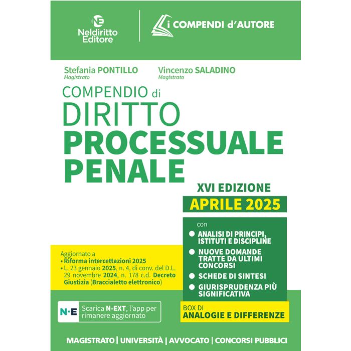 Il volume si inserisce nella collana "I Compendi d'Autore", ideata e strutturata appositamente per tutti coloro che si apprestano alla preparazione degli esami orali per l'università e per l'abilitazione alla professione forense o ancora per le prove dei principali concorsi pubblici. L'opera è frutto di una felice combinazione tra gli aspetti caratteristici, da un lato, della tradizionale trattazione manualistica, di cui conserva la struttura e l'essenziale impostazione nozionistica, e, dall'altro, della più moderna trattazione "per compendio", di cui fa proprie la capacità di sintesi e la schematicità nell'analisi degli istituti giuridici con particolare riguardo agli aspetti pratici ed alle conseguenze concrete. Ne è derivato un modello di "terza generazione" di testi per la preparazione alle prove d'esame, in cui l'imperativo è possedere tutte le conoscenze necessarie e sufficienti per raggiungere brillantemente l'obiettivo finale. A tal fine, le direttrici lungo cui si è sviluppata la collana sono state chiarezza nella forma e completezza nella sostanza. Anche nelle Edizioni 2025 la Collana è arricchita dall'inserimento di box di Analogie e differenze, utilissimi nella preparazione perché volti a mettere in evidenza gli elementi comuni e di distinzione tra Istituti affini. La tecnica utilizzata nei box rende di agevolissima fruizione, comprensione e memorizzazione aspetti talvolta non semplici e, tuttavia, essenziali delle discipline trattate. Il Volume dedicato al Diritto processuale penale si compone di 16 capitoli attraverso i quali si ricostruisce lo svolgimento del processo penale, seguendo l'ordine del codice di rito. Le diverse fasi e gli istituti del processo penale sono trattati nei loro elementi essenziali, individuandone, di volta in volta, caratteri, funzioni e presupposti. L'Opera combina le nozioni processuali con i principali aspetti della prassi dei tribunali e delle aule giudiziarie, con l'obiettivo di conciliare gli aspetti tecnici dei vari istituti e delle varie fasi processuali.