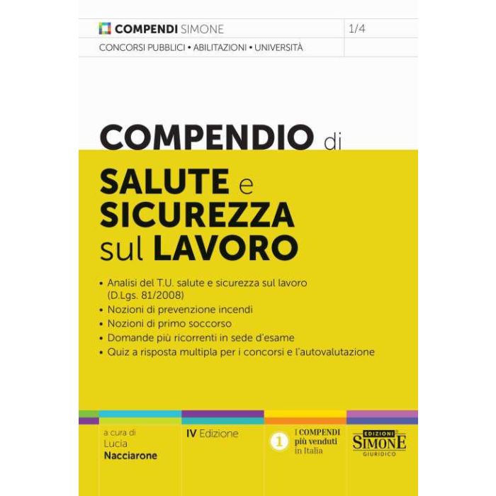 Il "Compendio di Salute e sicurezza sul lavoro" è uno strumento essenziale per studenti universitari e per coloro che intendono prepararsi per i concorsi pubblici. L'edizione 2024 dei Compendi Simone è attraversata da una fase di profondo cambiamento nella grafica, nella struttura e nel modo in cui sono trattati gli argomenti, attraverso un linguaggio più semplice e immediato. Il D.Lgs. 81/2008 (T.U. in materia di tutela della salute e della sicurezza nei luoghi di lavoro), con cui si è provveduto a dare sistematicità alla disciplina della salute e sicurezza dei lavoratori, è stato oggetto di numerose modifiche nel corso degli anni, delle quali si dà conto in questa quarta edizione del Compendio. Alcuni aspetti della materia della sicurezza hanno poi avuto una regolamentazione anche europea: ci si riferisce alla normativa sui dispositivi di protezione individuale, introdotta con il Regolamento (UE) 2016/425. Il testo, dunque, offre un quadro completo e organico della materia, illustrando in sintesi e con chiarezza gli istituti fondamentali e le tematiche di maggiore importanza, fra le quali anche la prevenzione e sicurezza incendi sul lavoro nonché il primo soccorso. Inoltre, questa edizione si presenta profondamente innovata nella grafica per la presenza di icone che guidano e semplificano la lettura, consentendo una più facile memorizzazione dei concetti chiave. Arricchiscono il Compendio di Salute e sicurezza sul lavoro i questionari alla fine di ogni capitolo, strumenti utili per riepilogare gli argomenti studiati, nonché un test con quiz a risposta multipla per valutare la propria preparazione in vista di prove di esame e concorsi pubblici.