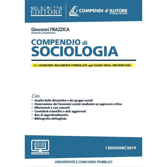Il volume "Compendio di sociologia" si indirizza agli studenti universitari, ai candidati a concorsi pubblici e in generale a tutti coloro che si apprestano ad affrontare una prova orale. In questa edizione si è proceduto ad un rinnovamento radicale dei volumi al fine di soddisfare al meglio le esigenze di chi ha poco tempo a disposizione per preparare la prova e incontra difficoltà per l'elevato numero di nozioni (anche di materie diverse tra loro) da memorizzare. "I Compendi d'Autore" sono gli strumenti giusti per superare queste due difficoltà grazie a: chiarezza e semplicità nell'esposizione delle nozioni e dei principi fondamentali; sinteticità ma al tempo stesso completezza nei contenuti. In particolare, i volumi si connotano per: articolazione chiara e immediata degli argomenti in paragrafo e sottoparagrafi interni; esposizione schematica "per punti" delle principali tesi sulle questioni più problematiche; evidenziazione, tramite l'utilizzo di grassetti e corsivi, dei concetti-chiave di ogni singolo istituto; attenta selezione delle più importanti e recenti decisioni sulla giurisprudenza, segnalate in appositi box contenenti "La giurisprudenza più significativa"; segnalazione delle principali domande d'esame alla fine di ogni capitolo, utili per un rapido riepilogo delle nozioni apprese e per "testare" il livello di preparazione raggiunto; dettagliato indice analitico-alfabetico, per agevolare la ricerca degli istituti. Si tratta di strumenti appositamente pensati per aiutare chi non può fare ricorso a trattazioni troppo lunghe e necessita di un'opera, che, in un limitato numero di pagine, fornisca in modo chiaro e completo tutto ciò che non è possibile non sapere per superare la prova.