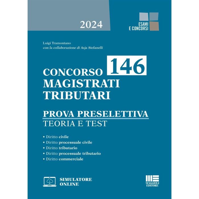 Il presente volume vuole offrire al lettore uno strumento indispensabile per prepararsi alla prova preselettiva prevista per il concorso di magistratura tributaria. La prova richiede la soluzione di 75 quesiti a risposta multipla da risolvere nel tempo massimo di 60 minuti sulle seguenti materie: diritto tributario; diritto processuale tributario; diritto civile e commerciale; diritto processuale civile. Il manuale comprende i materiali completi per la preparazione teorica nelle materie oggetto di esame, aggiornate alle più recenti novità legislative, tra cui gli ultimi interventi che hanno interessato il sistema tributario, dalla Legge di Bilancio 2024 ai decreti attuativi della Riforma fiscale, e i quiz per l'esercitazione pratica necessaria al superamento dei test. Completa il volume una sezione online che comprende: il simulatore di quiz per la prova preselettiva; gli aggiornamenti fino allo svolgimento della prova.