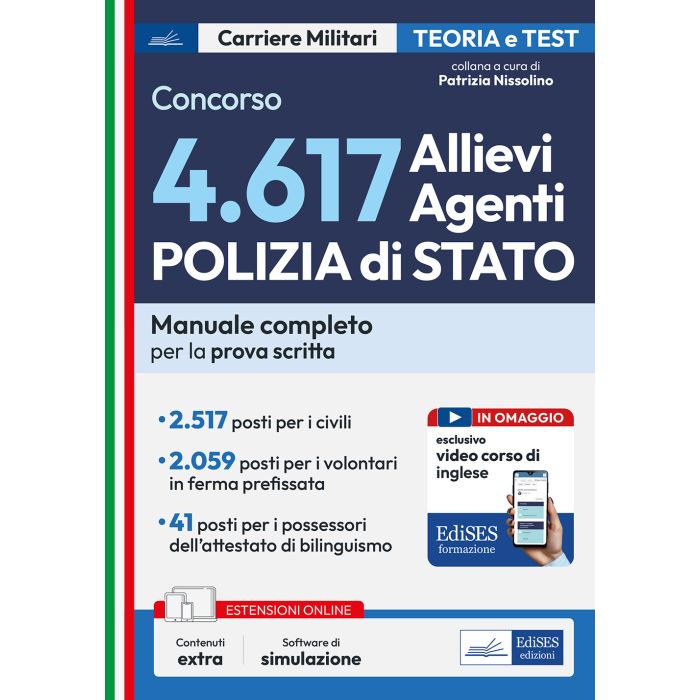 Manuale per la preparazione alla prova scritta del concorso per 4.617 Allievi agenti della Polizia di Stato: 2517 posti riservati ai cittadini provenienti dalla vita civile; 2059 posti riservati ai volontari in ferma prefissata (VFI, VFP1, VFP4); 41 posti riservati ai possessori dell'attestato di bilinguismo. Il testo, dopo aver fornito indicazioni sulla figura professionale dell'Agente di Polizia di Stato e sulle prove d'esame, affronta le materie previste dal bando: lingua e letteratura italiana matematica storia cittadinanza e Costituzione lingua inglese ragionamento logico-matematico e critico-verbale geografia, scienze, tecnologia (per la prova scritta dei volontari in ferma prefissata). In omaggio il software di simulazione per esercitarsi online e il videocorso completo di lingua inglese.