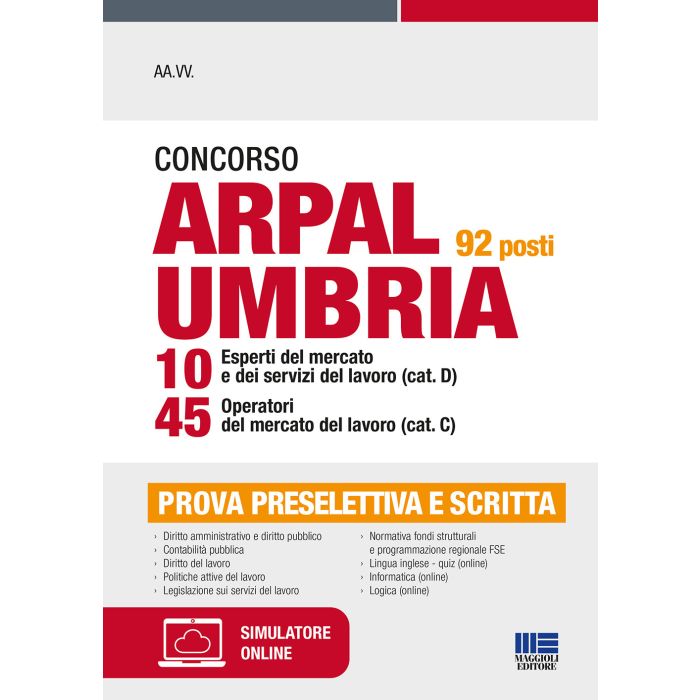 Il volume si presenta come utile strumento di preparazione alla prova scritta dei Concorsi indetti dall'Arpal Umbria per 92 posti, in particolare per 45 Operatori (cat. C) e 10 Esperti (cat. D) del mercato e dei servizi del lavoro. Il bando prevede di selezionare i candidati attraverso le seguenti prove: prova preselettiva: test con domande di ragionamento logico e domande sulle materie oggetto delle prove scritta e orale; prova scritta: quesiti a risposta aperta sulle materie previste dal bando; prova orale: colloquio sulle materie oggetto della prova scritta e verifica della conoscenza della lingua inglese e di informatica. Il testo propone una trattazione teorica sulle materie richieste ai candidati, ovvero: Diritto amministrativo e diritto pubblico; Contabilità pubblica; Diritto del lavoro; Legislazione statale e regionale in materia di servizi per il lavoro; Normativa nazionale e regionale relativa all'inserimento lavorativo delle persone con disabilità; Normativa comunitaria in materia di fondi strutturali, con particolare riferimento al Fondo sociale europeo e programmazione regionale in materia di servizi al lavoro e politiche attive a valere sul FSE. Nella sezione online collegata, raggiungibile seguendo le istruzioni riportate in fondo al libro, sono disponibili: videolezioni di logica e quiz di logica, utili per la preparazione della prova preselettiva; quiz di lingua inglese; teoria e quiz di informatica; simulatore di quiz con tutte le materie richieste dal bando.
