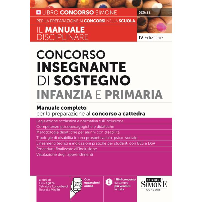 Il manuale "Concorso insegnante di sostegno Infanzia e Primaria" è indirizzato a chi intende prepararsi in vista delle prove per i posti di sostegno del concorso scuola. Il testo, a tal fine, presenta un'ampia trattazione di tutti gli argomenti previsti nel programma d'esame, coniugando le nozioni teoriche riferite all'inclusione scolastica con gli aspetti più pratici della didattica speciale. Attraverso approfondimenti normativi, costanti riferimenti ai principali documenti nazionali e internazionali e le più appropriate metodologie didattiche a supporto della progettazione dei percorsi di apprendimento, si affrontano le tematiche dell'inclusione con una struttura articolata nelle seguenti parti: parte I Legislazione e normativa scolastica che propone una panoramica sulle norme che regolano la scuola e l'attività didattica degli insegnanti; parte II Ambito normativo, organizzativo e della governance che analizza la normativa sull'integrazione, i gruppi di lavoro per l'inclusione e le disabilità, la programmazione e la progettazione di interventi didattici e piani educativi individualizzati; parte III Ambito psicopedagogico e didattico che tratta le posizioni teoriche dei principali studiosi dell'età evolutiva (sviluppo cognitivo, affettivo, sociale), i processi, gli ambienti e i contesti di relazione e di apprendimento, i media per la didattica e le metodologie per l'inclusione; parte IV Ambito della conoscenza della disabilità e degli altri BES, sugli aspetti sia normativi che psicopedagogici dei disturbi evolutivi e i bisogni educativi speciali (DSA, stranieri, altri BES); parte V Strumenti operativi, dedicata alla compilazione dei modelli di PEI e alle proposte operative per la didattica inclusiva e per competenze. Con le sintesi alla fine di ogni capitolo si evidenziano le parole chiave di ciascun argomento per favorire un ripasso rapido dei contenuti fondamentali. Il libro Concorso Insegnante di sostegno Infanzia e Primaria , inoltre, è arricchito da una serie di espansioni online che contengono approfondimenti e documenti ufficiali di supporto alla preparazione.