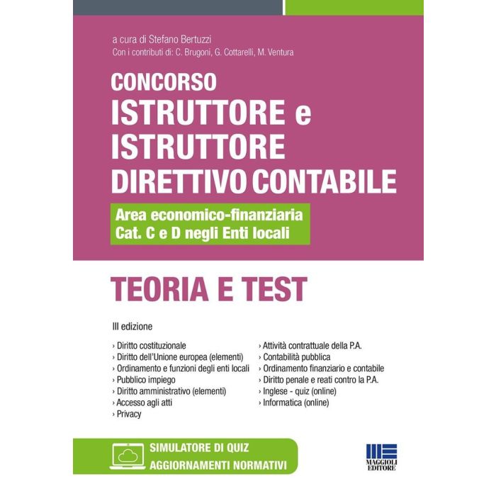 Il volume si presenta come strumento di studio per tutti coloro che partecipano ai concorsi per i ruoli di istruttore e istruttore direttivo contabile (cat. C e D) nell'area economico-finanziaria degli enti locali. Il testo propone una trattazione teorica chiara e completa sulle materie generalmente richieste ai candidati durante le prove concorsuali, ovvero: Diritto costituzionale; Diritto dell'Unione europea (elementi); Ordinamento e funzioni degli enti locali; Pubblico impiego; Diritto amministrativo (elementi); Accesso agli atti; Privacy; Attività contrattuale della P.A.; Contabilità dello Stato e degli enti locali; Ordinamento finanziario e contabile degli enti locali; Diritto penale e reati contro la P.A. Ogni sezione è seguita da una selezione di quiz a risposta multipla svolti e commentati per un breve ripasso una rapida verifica di quanto appreso. Nella sezione online collegata, raggiungibile seguendo le istruzioni riportate in fondo al libro, sono disponibili anche: simulatore di quiz; quiz di lingua inglese con risposta commentata; teoria e quiz di informatica; aggiornamenti normativi.