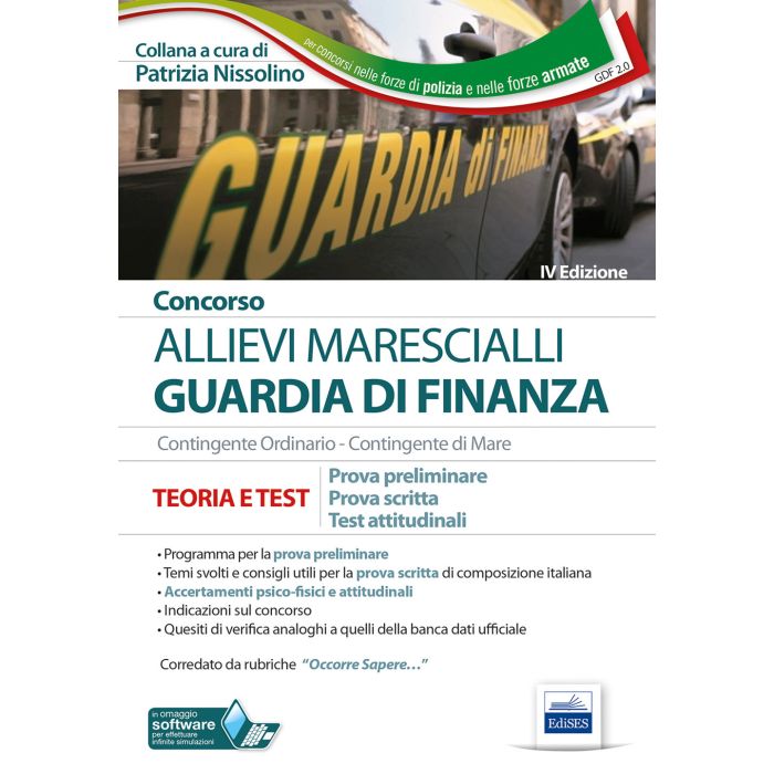 Il volume è indirizzato a quanti intendono prepararsi alle prime fasi del concorso per l'ammissione alla Scuola Ispettori e Sovrintendenti per la formazione dei Marescialli, indetto dal Comando Generale della Guardia di Finanza. Il testo, infatti, tratta la prova preliminare, la prova scritta di composizione italiana e gli accertamenti psico-fisici e attitudinali. Il testo è articolato in Parti. Nella prima parte sono descritti ruoli, compiti, prospettive di carriera; come si svolge il concorso, consigli per la tutela all'inidoneità. Nella seconda parte è illustrato tutto il programma d'esame della prova preliminare che consiste in test logico-matematici e in domande dirette ad accertare le abilità linguistiche, ortogrammaticali e sintattiche della lingua italiana e in una vasta raccolta di quesiti a risposta multipla analoghi (per argomento e difficoltà) a quelli della banca dati ufficiale. Nella terza parte sono forniti alcuni consigli su come impostare e sviluppare un elaborato di italiano, elenco delle tracce assegnate nei concorsi precedenti, tracce sviluppate di storia, attualità e cultura generale. Nella quarta parte sono trattati i principali test attitudinali.