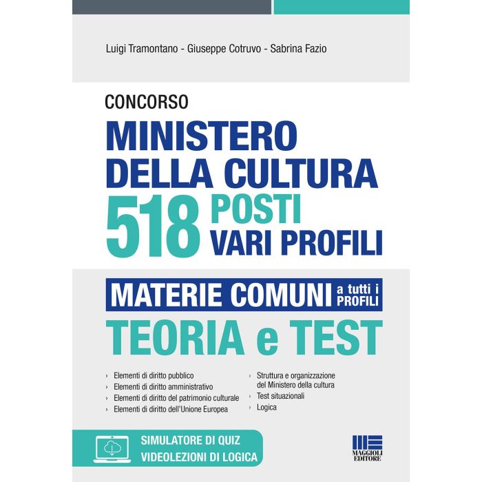 Il volume si presenta come utile strumento di preparazione a tutte le prove del Concorso per 518 posti, profili vari, da assumere presso il Ministero della Cultura. Il bando prevede di selezionare i candidati attraverso una prova scritta e un colloquio orale. La prova scritta consiste in un test da risolvere in 60 minuti composto da 40 domande così suddivise: 10 quesiti comuni a tutti i profili professionali; 15 quesiti, distinti per ciascun profilo professionale sulle specifiche materie del profilo; 8 quesiti volti a verificare la capacità logico-deduttiva e di ragionamento critico verbale; 7 quesiti situazionali relativi a problematiche organizzative e gestionali. La prova orale consiste in un colloquio sulle materie della prova scritta e sull'accertamento della conoscenza della lingua inglese e delle applicazioni informatiche più diffuse. Il manuale presenta una trattazione chiara e completa sulle materie comuni a tutti i profili: Elementi di Diritto pubblico; Elementi di Diritto amministrativo con particolare riferimento alla disciplina del lavoro pubblico, alle responsabilità dei dipendenti pubblici e al procedimento amministrativo; Elementi di Diritto del patrimonio culturale; Elementi di Diritto dell'Unione europea; Struttura e organizzazione del Ministero della cultura; Test situazionali. L'ultima parte contiene una selezione di quiz di logica tratti dalle prove ufficiali di recenti concorsi, svolti e commentati da Giuseppe Cotruvo. Nella sezione online collegata, raggiungibile seguendo le istruzioni riportate in fondo al libro, sono disponibili: simulatore di quiz; quiz di lingua inglese; teoria e quiz di informatica; videolezioni di logica.