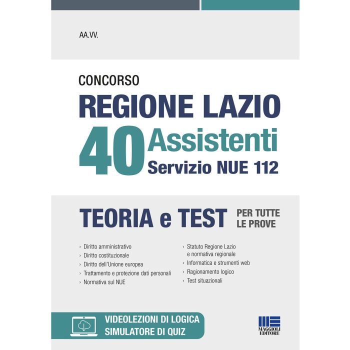 Il volume si presenta come utile strumento di preparazione alle prove del Concorso della Regione Lazio per 40 Assistenti area tecnica del Servizio NUE 112 (G.U. 16 agosto 2022, n. 65). La selezione dei candidati avverrà attraverso una prova scritta e un colloquio orale. La prova scritta consisterà in un test di 40 domande a risposta multipla sulle seguenti materie: elementi di Diritto amministrativo; elementi di Diritto costituzionale e di Diritto dell'Unione europea; normativa in materia di trattamento e protezione dei dati personali; normativa concernente il Numero Unico dell'Emergenza; Statuto Regione Lazio, legge regionale del Lazio n. 6/2002 e regolamento regionale del Lazio n. 1/2002; nozioni di informatica e di strumenti web; ragionamento logico; test situazionali. Il testo presenta una trattazione chiara e completa su tutte le materie oggetto delle prove. Nella sezione online collegata, raggiungibile seguendo le istruzioni riportate in fondo al libro, sono disponibili anche: sezioni dedicate a Pubblico impiego e reati contro la P.A.; simulatore di quiz; videolezioni di logica; quiz di lingua inglese.