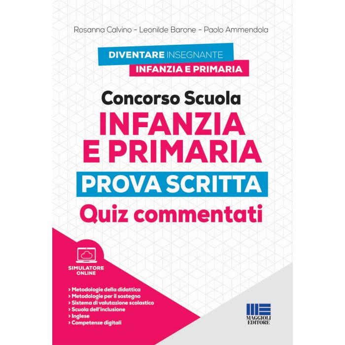 Il testo è un indispensabile strumento per la preparazione alla prova scritta del Concorso per docenti della scuola dell'infanzia e della scuola primaria. Presenta un'ampia rassegna di quesiti a risposta multipla con soluzione commentata sulle seguenti materie: metodologie didattiche e programmazione per la scuola dell'infanzia e la scuola primaria; metodologie didattiche da applicarsi alle diverse tipologie di disabilità per la scuola dell'infanzia e primaria; teorie e metodologie della didattica (ambienti di apprendimento e metodologie, organizzazione e gestione di una lezione efficace, uso delle tecnologie dell'informazione, LIM e sussidi multimediali, CLIL); sistema di valutazione scolastico (INVALSI, valutazione degli apprendimenti); scuola dell'inclusione (didattica speciale, disabilità certificata, DSA, BES); dimensione europea della scuola; lingua inglese; competenze digitali. Nella sezione online raggiungibile tramite il codice riportato in fondo al volume, è disponibile un utile simulatore di quiz per continuare ad esercitarsi in vista della prova.