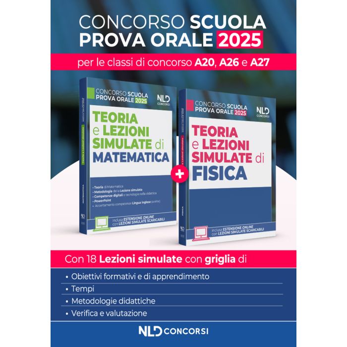 Il volume "Teoria e lezioni simulate di Matematica e Fisica", NLD concorsi 2025, è stato predisposto per assicurare una preparazione completa alla prova orale del Concorso scuola 2025, Classi A20,A26,A27. Il manuale, pur costituendo un'opera unitaria, è suddiviso in due tomi che ne rendono assai più agevole la consultazione. Il tomo I è articolato in cinque parti: la prima contiene la descrizione delle metodologie e strategie didattiche, un conciso esame delle tipologie dilezioni, della didattica per progetti, nonché l'inquadramento degli stili cognitivi e di apprendimento e del setting didattico. Sono, inoltre, illustrati i criteri di valutazione degli apprendimenti, anche alla luce della Riforma del voto in condotta di cui alla L. 1° ottobre2024, n. 150. La seconda offre una approfondita trattazione teorica di matematica. La terza contiene numerose Lezioni simulate di matematica sviluppate secondo una griglia che ne mette in risalto gli obiettivi formativi e di apprendimento, le finalità, i tempi, gli strumenti, le metodologie e le strategie didattiche, l'osservazione sistematica del docente e, in ultimo, la verifica e la valutazione. In apertura della Parte è inserita un'utilissima guida alla compilazione della griglia, per la progettazione della lezione. La quarta dà atto del ruolo della digitalizzazione nella scuola e nella didattica interattiva (LIM, Tablet, Smartphone, Monitor Touch Screen, E-Book), con un focus sul ruolo didattico dei social network. Completa la trattazione un approfondimento sulle operazioni di base e le funzionalità di Power Point. La quinta fornisce le basi per affrontare l'accertamento delle capacità di comprensione e conversazione in lingua inglese almeno al livello B2. Nel tomo II, dedicato alla fisica, la prima parte contiene un'approfondita trattazione teorica della materia, mentre la seconda parte offre numerosi esempi di Lezioni simulate con relative griglie di obiettivi, finalità, tempi, strumenti e metodologie didattiche, valutazione. Il Manuale permette, infine, l'accesso ad una estensione online consultabile con apposita password per rimanere aggiornati sulle materie oggetto d'esame.