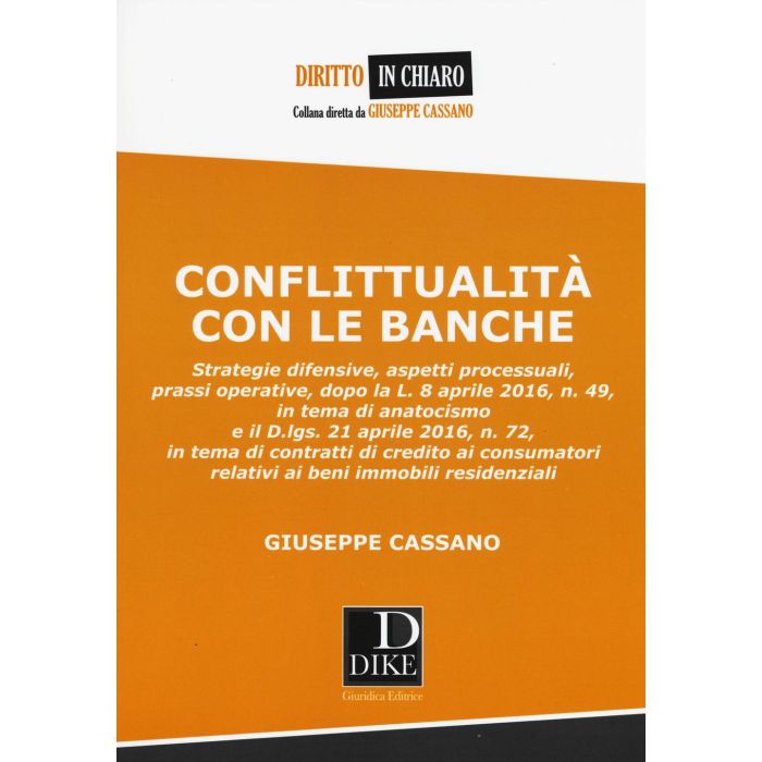 Il volume, scritto da un curatore con notevole esperienza e da un gruppo di professionisti e accademici di altrettanto valore, offre una guida sicura e completa per gli operatori chiamati a relazionarsi con il contenzioso bancario, ordinando i vari concetti che stanno emergendo dalla pratica e spiegando la giurisprudenza intervenuta in materia. Si sono scandagliate, in modo particolare, le tematiche della conflittualità stragiudiziale, della mediazione obbligatoria, gli aspetti processuali e le consulenze tecniche. Dopo l'approfondimento in tema di inadempimento e risoluzione del mutuo, il cuore del testo è caratterizzato dalle tutele nelle obbligazioni pecuniarie: interessi, anatocismo e usura bancaria alla luce delle ultime novità legislative del 2016 (D.L. 14 febbraio 2016, n. 18, convertito con modifiche dalla legge 8 aprile 2016, n. 49) Completano l'analisi le tutele nel leasing finanziario, nel finanziamento fondiario, nel factoring e nelle altre forme di finanziamento bancario (apertura di credito, anticipazione e sconto bancario) e nei contratti di credito ai consumatori relativi a beni immobili residenziali, alla luce del D.lgs. 21 aprile 2016, n. 72. Per meglio chiarire determinate questioni si è fatto uso di Schemi, Flussi, Casi, e si è scelto di approfondire le citazioni dottrinali e giurisprudenziali, solo se funzionali a dare risposte concrete ai dubbi che quotidianamente emergono dalla prassi.