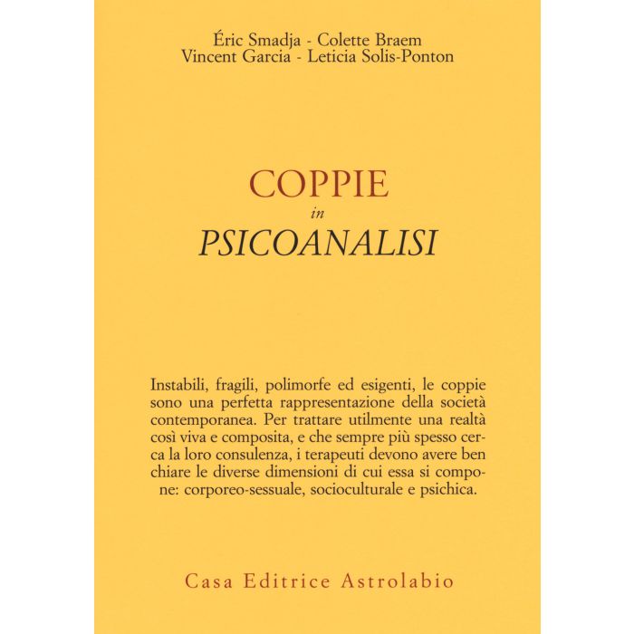 Uno dei problemi delle terapie di coppia del recente passato è stata la scarsa considerazione dei singoli individui, dotati ciascuno di una propria temporalità, spesso in conflitto con quella dell'altro membro. La terapia rappresenta uno spazio-tempo transizionale, posto fra l'insorgere del dolore e la definizione di un cambiamento sia individuale sia coniugale. Il lavoro da svolgere si declina su tre piani, fra loro intrecciati: il piano individuale, quello intersoggettivo e quello gruppale. Prendendo spunto dai lavori di grandi teorici (Anzieu, Freud, Green, Kaës, Roussillon, Winnicott), Smadja e i suoi colleghi Braem, Garcia e Solis-Ponton riflettono sulle terapie di coppia che hanno seguito oppure osservato da vicino, addentrandosi in alcuni dei conflitti più ricorrenti e suddividendoli in due categorie: da un lato le problematiche legate alla vita e alla storia 'naturale' di ogni coppia, come le relazioni erotiche e la sessualità, la questione del desiderio di un figlio (che porta con sé il passaggio potenzialmente distruttivo da coppia a famiglia); dall'altro due tipi di sofferenze nelle quali spesso ci si imbatte, come la violenza e le relazioni extraconiugali. I cinque casi descritti affronteranno aspetti clinici, tecnici e teorici, permettendo al lettore di confrontarsi con diverse modalità di lavoro e di riflessione psicoanalitica e di scoprire le relazioni fra questi tre settori, che caratterizzano le origini e i fondamenti epistemologici della psicoanalisi.