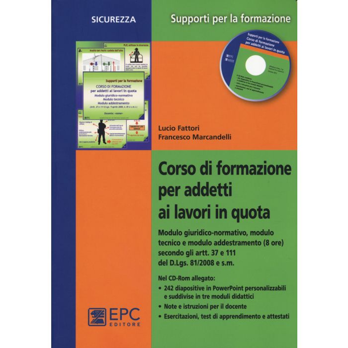 Questo prodotto contiene la traccia di un corso di formazione per addetti ai lavori in quota e che utilizzano attrezzature per i lavori in quota (scale, trabattelli ecc.) e anche DPI anticaduta e che devono essere formati ai sensi degli artt. 36, 37 e 78 del D.Lgs. 81/08. Il percorso proposto contiene 3 moduli: il modulo giuridico-normativo, incentrato sugli aspetti normativi e relativi a obblighi e responsabilità, il modulo tecnico, che affronta le differenti attrezzature e modalità per lo svolgimento dei lavori in quota e infine il modulo di addestramento, dedicato agli aspetti pratici sia dell'uso dei DPI e sia delle varie attrezzature per i lavori in quota, per un complesso di oltre 200 slide commentate strutturate per lo svolgimento di un corso di 8 ore. AI testo è allegato un CD Rom nel quale sono fornite le diapositive in formato PowerPoint oltre che le esercitazioni da utilizzare in aula, i questionari di valutazione e gli attestati di partecipazione.