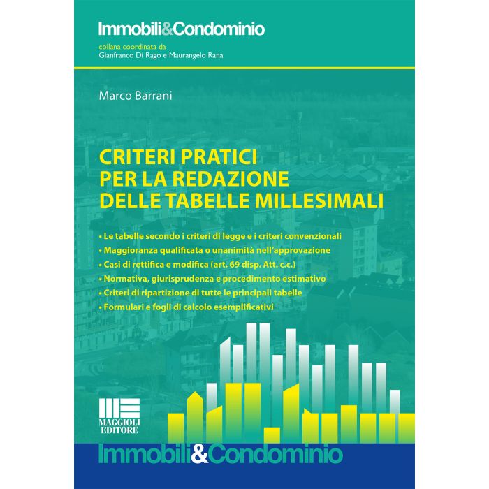La maggior parte dei libri attualmente in commercio riporta criteri generali e la trascrizione di articoli del codice civile e di massime giurisprudenziali, senza dare una precisa spiegazione delle metodologie pratiche e di calcolo e di come affrontare la vasta casistica che circonda ogni tabella millesimale. Cosicché, il tecnico redattore si trova di fronte a numerosi dubbi circa la corretta formazione delle tabelle. Il presente testo, invece, basato sulla decennale esperienza dell'autore e su uno studio particolarmente dettagliato ed approfondito del procedimento estimativo, non solo spiega "come si fanno" le tabelle ma fornisce precise istruzioni legate alle più importanti questioni di interpretazione, alla luce della giurisprudenza di settore. L'autore, volendo trattare l'argomento in un libro che potesse essere utile sia ai meno esperti della materia, sia a chi avendone già dimestichezza intendesse confrontarsi in merito ai casi più partico- lari e complessi, ha passato in rassegna tutti gli aspetti delle tabelle millesimali: dalla definizione stessa (cosa sono), alla distinzione tra le varie tabelle ed al relativo regime giuridico di approvazione (come si approvano), fino a trattare ogni operazione necessaria alla redazione dell'elaborato millesimale (come si fanno). Soprattutto, l'opera spiega ogni tabella attraverso lo studio della normativa, della giurisprudenza e degli orientamenti dominanti sulle questioni maggiormente dibattute e, infine, della prassi estimativa, fornendone precisa traduzione pratica anche attraverso casi studio esemplificativi, schemi sintetici e rappresentazioni grafiche per facilitare l'assimilazione dei concetti trattati. Il libro, inoltre, fornisce: i fogli di calcolo, predisposti dall'autore, dei casi studio trattati; i file editabili delle relazioni tecniche da allegare agli elaborati millesimali, predisposte dall'autore sulla base dei casi studio; un manuale, in appendice al libro, per agevolare la modifica dei fogli di calcolo e delle relazioni e predisporre nuove tabelle millesimali utilizzando gli strumenti ed i criteri forniti nel libro.
