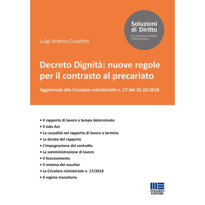 Soluzioni di Diritto è una collana che offre soluzioni operative per la pratica professionale o letture chiare di problematiche di attualità. Uno strumento di lavoro e di approfondimento spendibile quotidianamente. L'esposizione è lontana dalla banale ricostruzione manualistica degli istituti ovvero dalla sterile enunciazione di massime giurisprudenziali. Si giunge a dare esaustive soluzioni ai quesiti che gli operatori del diritto incontrano nella pratica attraverso l'analisi delle norme, itinerari dottrinali e giurisprudenziali e consigli operativi sul piano processuale. Il volume esamina nel concreto il contenuto e la portata delle modifiche introdotte dal nuovo Governo, con l'obiettivo di combattere il lavoro precario e di restituire con ciò ai lavoratori subordinati la "dignità" asseritamente perduta. Lo scopo del lavoro è quello di porre gli operatori del settore nelle condizioni di dare a tali novità normative la più corretta e proficua applicazione. L'Autore pone dunque alcuni interrogativi e fornisce ad essi risposte che consentono, per quanto possibile, di recepire al meglio il nuovo regime giuridico. Il principale responsabile della progressiva mancanza di stabilità dei rapporti di lavoro subordinato, e conseguentemente della (ritenuta) situazione di sudditanza e precarietà in cui si è venuta a trovare parte della popolazione, è stato individuato nella disciplina del rapporto di lavoro a tempo determinato, sul quale effettivamente più frequenti ed incisivi sono stati gli interventi del Legislatore negli ultimi anni. È quindi proprio sulla modifica della disciplina normativa del lavoro a termine, sia nella sua forma "diretta" (vale a dire l'assunzione del lavoratore da parte del soggetto che, in qualità di datore di lavoro formale e sostanziale, effettivamente ne utilizza la prestazione lavorativa) sia nella forma della somministrazione di lavoro (e quindi attuata mediante l'assunzione da parte di un'agenzia per il lavoro, che assume la veste di datore di lavoro formale e che poi provvede a somministrare il lavoratore al soggetto che effettivamente ne utilizza la prestazione lavorativa e che assume la veste di datore di lavoro sostanziale), che il "Decreto Dignità" concentra i propri interventi di maggiore respiro.