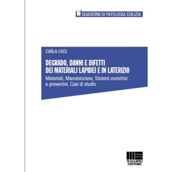 Il manuale descrive e analizza le patologie dei materiali lapidei naturali e dei laterizi per fornire al lettore indicazioni utili per il loro corretto utilizzo, soprattutto nella prevenzione delle possibili patologie. L'opera è arricchita con immagini, tabelle, grafici e casi studio. A corredo, una copiosa bibliografia rimanda a specifici approfondimenti dei temi discussi. Viene fornita la descrizione chimica, fisica e meccanica dei materiali lapidei naturali, quindi delle rocce utilizzate come pietre da costruzione, trattando anche l'influenza della finitura superficiale sulla suscettibilità al deterioramento e i difetti più frequenti manifestati dalle pietre utilizzate come rivestimento. Un corposo spazio è dedicato alla caratterizzazione dei laterizi, materiali lapidei artificiali che meritano attenzione poiché ampiamente utilizzati sia nell'edilizia storica sia contemporanea. Non manca una sintesi delle principali tecniche diagnostiche e della normativa di riferimento vigente. Infine, il lettore troverà riassunti, in forma di schede illustrative, i meccanismi di danno e i difetti di cui sono state trattate le cause nel testo. Si tratta quindi di un volume pressoché unico nel campo della diagnostica, utile al professionista, al patologo edile e al progettista, che vogliano approfondire i fenomeni patologici che si verificano a carico dei materiali lapidei.