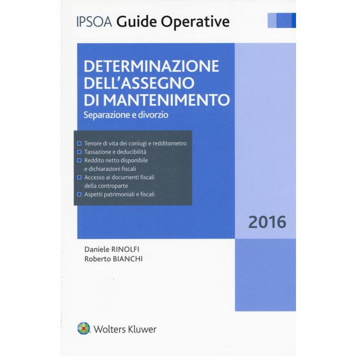 Il volume analizza in maniera innovativa gli aspetti correlati alla determinazione dei differenti elementi necessari alla quantificazione dell'assegno di mantenimento nell'ambito dei procedimenti di separazione e divorzio. Si rivolge ai dottori commercialisti ed agli esperti contabili che possono essere chiamati ad intervenire nel corso dei giudizi in qualità di CTU o CTP ed a tutti i professionisti che operano nell'ambito del diritto di famiglia, ovvero ai legali ed ai magistrati. Sono trattati i criteri ed i principi che sottendono alla individuazione del tenore di vita goduto in costanza di matrimonio e delle consistenze reddituali e patrimoniali dei coniugi, anche alla luce del recente studio sul tema pubblicato dal CNDCEC il 19 maggio 2016. Di assoluta novità è il capitolo relativo alla possibilità di accedere ai documenti fiscali ed ai rapporti finanziari della controparte, oltre che all'indicazione dei criteri semplici, ma al tempo stesso oggettivi, finalizzati alla quantificazione del valore del patrimonio immobiliare. Sono stati, inoltre, illustrati i diversi e peculiari aspetti concernenti il trattamento fiscale dell'assegno di mantenimento e l'assegnazione della casa coniugale. Tutte le tematiche sono state analizzate anche in relazione alla recente legge sulle unioni civili (Legge 20 maggio 2016, n. 76).