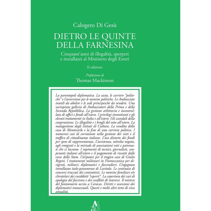 Il volume è un saggio critico sul mondo della diplomazia italiana visto dall'interno da un funzionario che vi ha vissuto per 43 anni. Per la prima volta i vizi storici, le prassi anomale, gli scandali sono evocati in maniera comprensibile. Gli argomenti sono trattati con riferimenti storici, normativi, giornalistici, politici, giudiziari mentre la narrazione di fatti, eventi ed episodi si riferisce a vicende e personaggi reali. L'approccio è innovativo in quanto diretto e schietto; rivoluzionarie, invece, sono le proposte dirette a introdurre trasparenza, onestà, apertura al mondo esterno e spirito di servizio in un gruppo sociale chiuso a tutela dei propri privilegi. Con quest'opera l'autore intende contribuire al rinnovamento politico e morale del Paese.