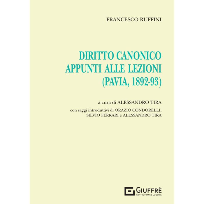 Francesco Ruffini (1863-1934) fu tra i fondatori del diritto ecclesiastico «in senso moderno», la materia che sul finire del XIX secolo si unì al diritto canonico, di più antica tradizione accademica, per poi prenderne il posto. Le Lezioni tenute a Pavia nell'anno accademico 1892-93 testimoniano l'esordio in cattedra dello studioso, aggiungendo elementi nuovi e importanti per la conoscenza del suo pensiero e circa la vicende della nascente disciplina. Il corso, infatti, venne riportato solo in appunti a uso degli studenti, litografato in pochissimi esemplari con diffusione locale e, fino a oggi, era rimasto sostanzialmente ignoto, non citato in dottrina né censito in alcuna biblioteca. L'edizione del testo è accompagnata da saggi introduttivi in cui vengono approfonditi diversi aspetti dell'esperienza biografica e intellettuale del primo Ruffini: le vicende che lo portarono sulla cattedra pavese e i punti di contatto con i percorsi degli allievi formatisi tra Pavia e Genova; le linee di sviluppo tra il suo pensiero di giovane studioso e le posizioni della maturità, soprattutto in tema di relazioni tra Stato e Chiesa e diritti di libertà; infine il fondamentale rapporto, che Ruffini tenne sempre vivo, con la cultura giuridica tedesca dell'epoca.
