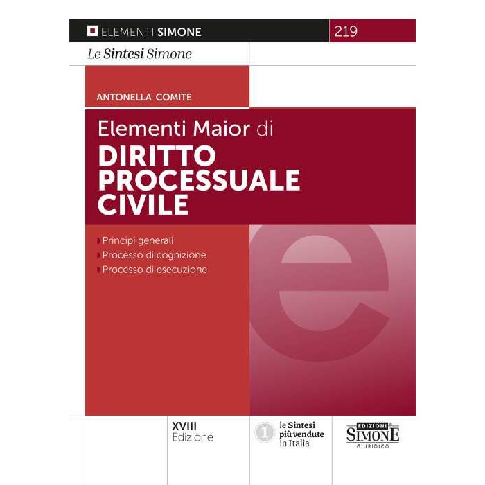 Con la collana Elementi bastano pochi giorni per cogliere e memorizzare i concetti essenziali della disciplina. Ogni testo, infatti, tratta tutti gli argomenti che di regola rientrano nei programmi d'esame, mettendo in evidenza soprattutto quelli più richiesti dagli esaminatori. Gli Elementi Maior Simone, pertanto, sono strumenti perfetti per un ripasso degli ultimi giorni o per venire incontro a chi, trovandosi in ritardo nella lettura del manuale, ha esigenza di completare, in breve tempo, la preparazione dell'intero programma. Questa nuova edizione di Elementi Maior di Diritto Processuale Civile, consente, grazie al linguaggio semplice ed all'esposizione sintetica, una visione d'insieme della complessa materia processuale. È una sintesi che risulta utile per tutti coloro che abbiano la necessità di avere un quadro aggiornato, sintetico e completo del rito civile, sia per un veloce ripasso, sia per la preparazione di concorsi. L'intento è di agevolare lo studio di questa materia anche attraverso una serie di originali rubriche quali: un Glossario, con le definizioni delle parole più tecniche, indispensabili per facilitare la comprensione del lessico giuridico; un riquadro relativo alle Analogie e Differenze fra gli istituti che possono suscitare perplessità per la similitudine e un riquadro relativo alla Disciplina Precedente alla Cartabia in considerazione del regime transitorio.