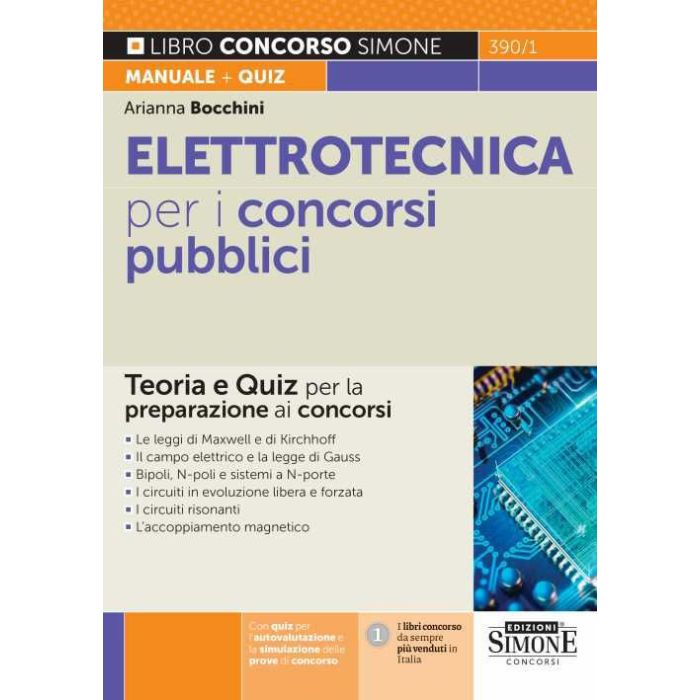 Il manuale "Elettrotecnica per i concorsi pubblici" nasce per venire incontro alle esigenze di chi intende partecipare ai sempre più frequenti concorsi nella P.A. per i profili tecnici ed è stato costruito sulla base degli argomenti maggiormente richiesti nei bandi. Il testo riporta le nozioni fondamentali della materia, che riguarda le applicazioni pratiche dell'elettricità, ossia produzione, trasporto e utilizzo dell'energia elettrica attraverso opportune tecniche. In particolare, sono analizzati i seguenti argomenti: le leggi di Maxwell e di Kirchhoff; il campo elettrico e la legge di Gauss; bipoli, N-poli e sistemi a N-porte; i circuiti in evoluzione libera e forzata; i circuiti risonanti; l'accoppiamento magnetico. A completamento del libro è riportata una batteria di quiz a risposta multipla su tutte le tematiche trattate, ai fini di una corretta autovalutazione. Il manuale, per le caratteristiche descritte, è consigliato per la preparazione ai concorsi negli enti locali, nei Ministeri e nei Vigili del Fuoco, in quanto costituisce uno strumento di ripasso per chi già possiede consolidate basi in tale disciplina, ma rappresenta un valido aiuto anche per chi la studia per la prima volta.